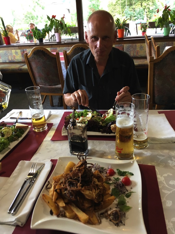 Abfahrt pünktlich um 13:00 in Lannach mit dem bewährten Taxiunternehmer Wolfgang Tschentsche, dem Betriebsrat sei hiermit gedankt. Wir scheuen die ausgeprägten Stauzonen rund um den Walserberg und fahren über das Ennstal, Bihofen und Saalfelden ins Inntal. Kurze Rast bei einem ungarisch geführten Gasthof mit gutem Essen. Um 20:30 kommen wir beim schönen Hotel Tyrolis in Zirl in Tirol an. Beim Abendessen im hauseigenen Restaurant fällt dann etwas überraschend gleich die endgültige Entscheidung in der diesjährigen Gesamtwertung: Ferdl trinkt ein alkoholfreies Safterl, Franz und Wolfi essen einen leichten griechischen Salat. Und somit the winner (again) is...