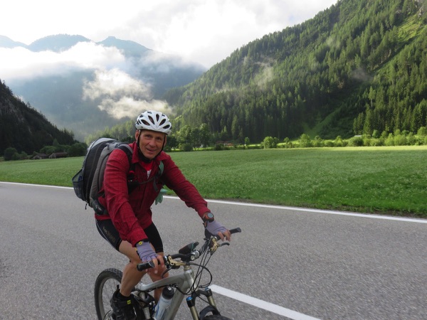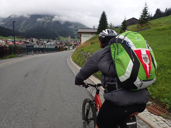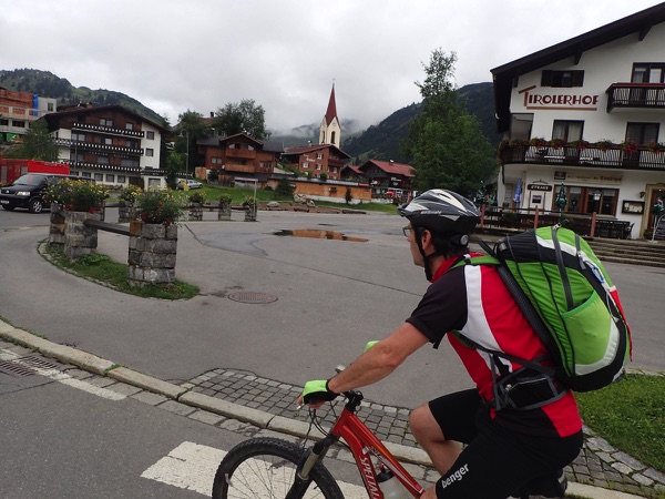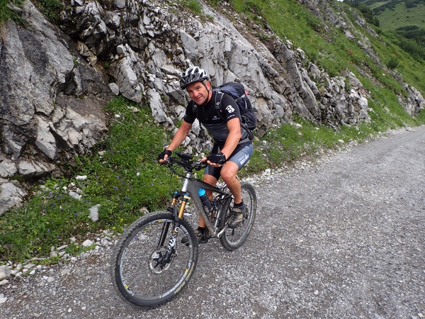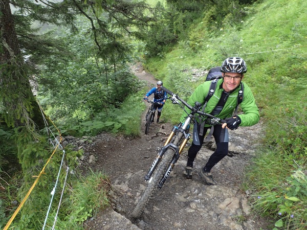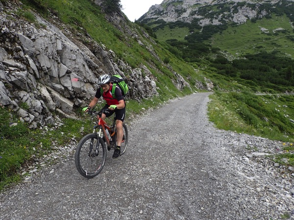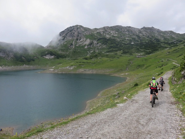 Gewitter in der Nacht, aber zum Frühstück um 07:00 reisst es schon wieder auf und wir starten trockenen Mantels Richtung Warth. Es folgen dreihundert einsame Höhenmeter bis zur Kreuzung nach Lech. Auf der kurzen Abfahrt genießen wir auf der Vorarlberger Seite den herrlichen Ausblick in das Arlbergmassiv.