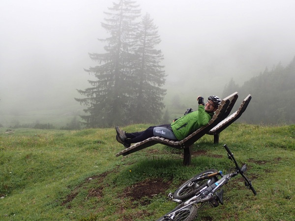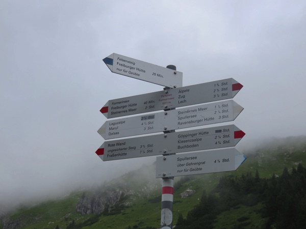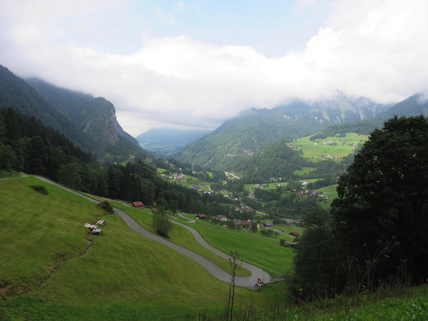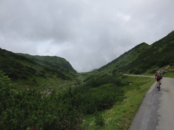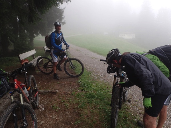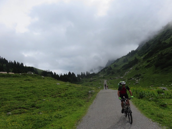 Die letzten dreihundert Höhenmeter hinunter nach Dalaas rasen wir auf Asphalt und finden nach etwas Sucherei das noble Gasthaus zur Post. Das Essen ist gut (und nach Bestellung der extra Portion Nudeln auch ausreichend), nur die Preise scheinen sich schon etwas an das schweizerische Niveau angepasst zu haben. Mit vollem Bauch und schweren Beinen nehmen wir die siebenhundert Höhenmeter hinauf zum Kristbergsattel in Angriff. Das Wetter bleibt trocken, wenn auch die tiefhängenden Wolken und der Bodennebel die Luftfeuchtigkeit auf gefühlt deutlich über 100% steigen lassen.