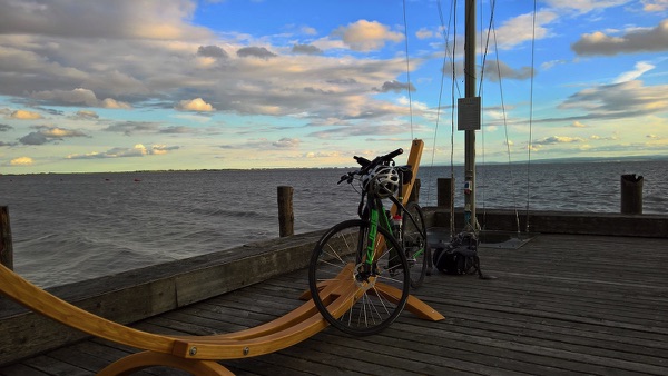 Wir rollen weiter Richtung Süden, der Rückenwind hilft uns nun wieder etwas, ist auch ganz gut so nach mehr als 180 Kilometern. Schön auch der Kontrast zwischen der historischen Kulturlandschaft und den sich rasch drehenden modernen Windrädern die hier die Landschaft optisch prägen. Sogar die letzten Kuppen werden noch mit Attacke und Gegenattacke genommen, weil es halt so Spaß macht. In Neusiedl am See fahren wir dann zum südlichsten Zipfel zur Mole West, wir treffen Martin und machen uns einen schönen Abend in der hippen Bar mit tollem Ausblick über den Neusiedler See und ein zwei drei vier Glas gutem Wein.