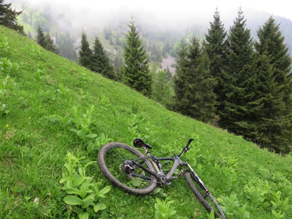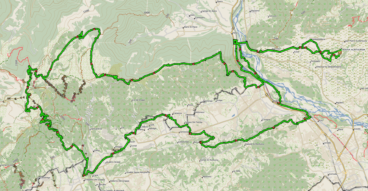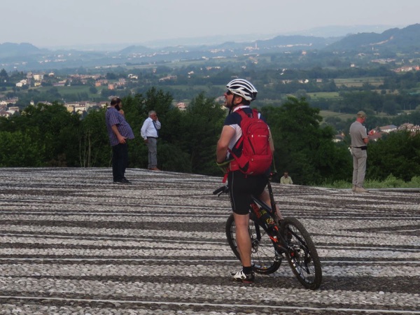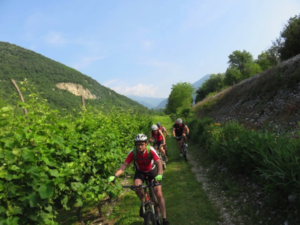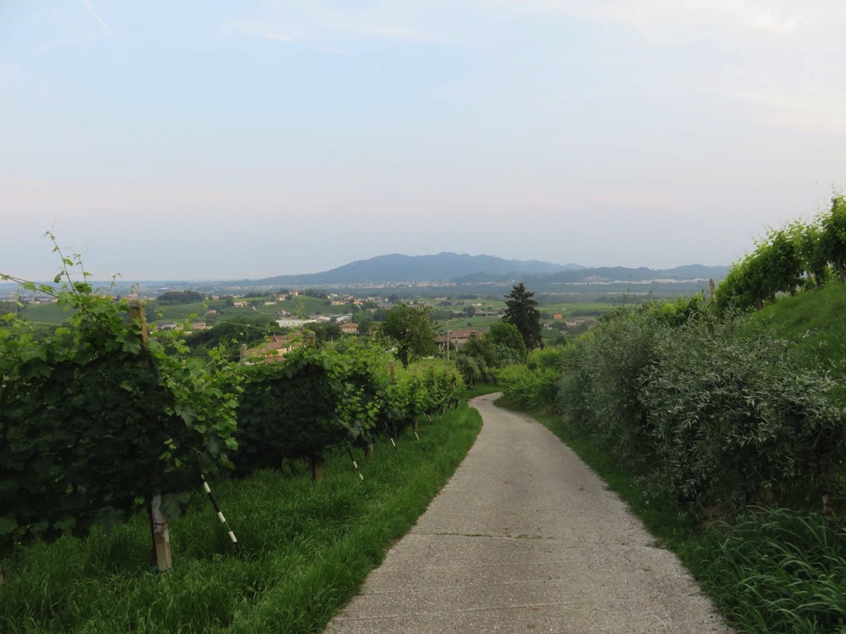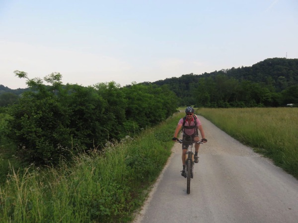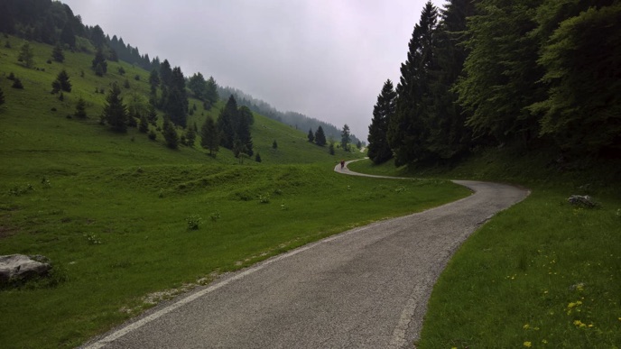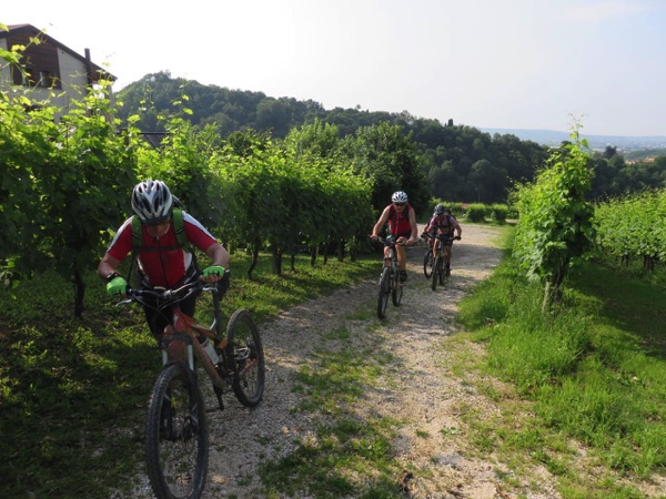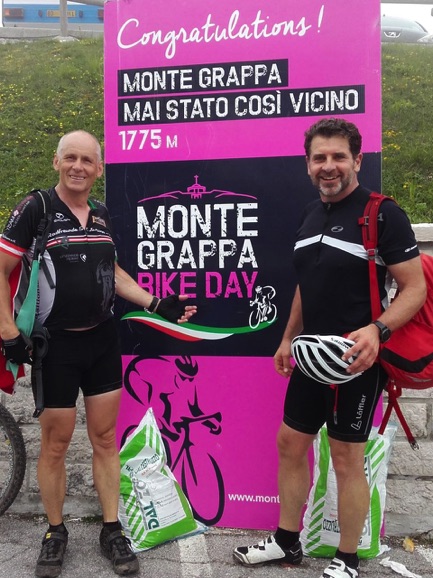 Knapp vor 09:00 geht es nach herrlichem Frühstück wieder los, leider aber nur zu fünft, denn Mario muss wie erwartet seine Wunden lecken. Aber er wird denn Tag nicht sinnlos verbringen, denn er plant zum Weingut Villa Sandi zu fahren um unsere Prosecco Vorräte aufzufrischen. Gemütlich rollen wir also hinunter nach Valdobbiadene und fahren entlang eines Kanals in Richtung des Süd-Ost-Zipfels des Monte Grappa Massivs. Der Aufstieg durch eine knackige Waldpasage beginnt nach kurzer Fahrt dann gleich mit einem weiteren Dornen-Patschen von Günther. An diesem Tag sind auch viele Rennradfahrer unterwegs hinauf zum Monte Grappa, es ist schließlich Monte Grappa Bike Day (Franz bekommt oben sogar ein Leiberl...)