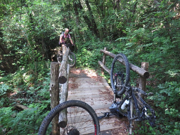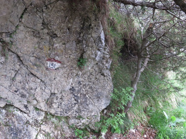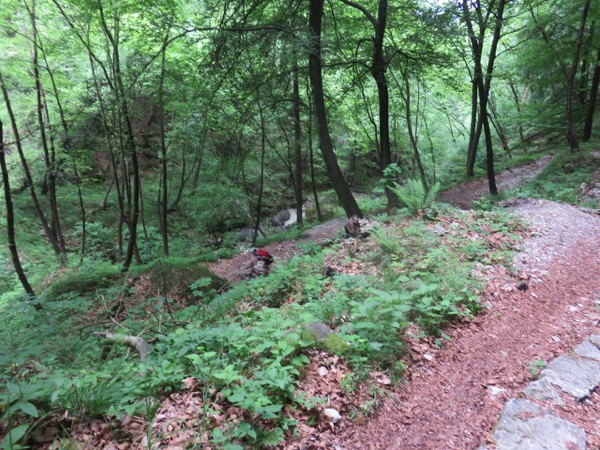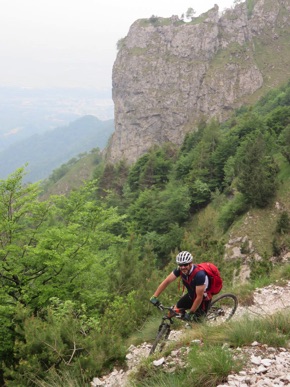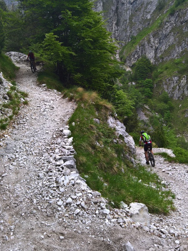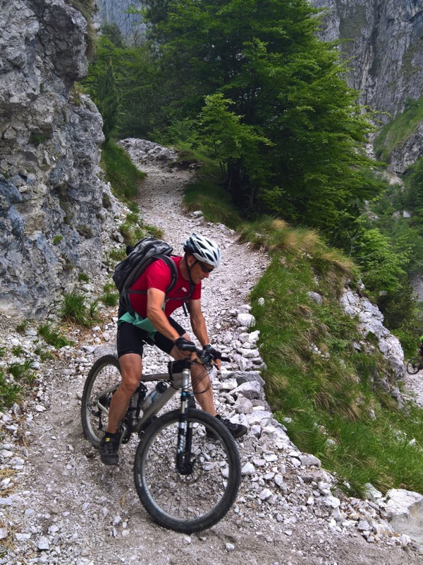 Wir fahren über Günther‘s Variante (der einzig wahren...) retour in Richtung der schwer zu findenden Einmündung zum Sentiero 151. Unterwegs findet Ferdl dann sogar noch die Trinkflasche von Günther wieder. Der Wanderweg ist anfangs steil, grobschottrig und in den Kehren teilweise ausgesetzt, dennoch meist fahrbar. Unten hinaus wird es dann schon fast kitschig, ein echtes Mountainbike-Gustostückerl.