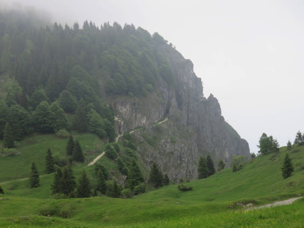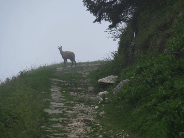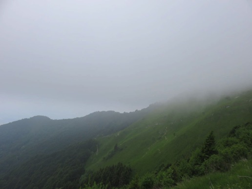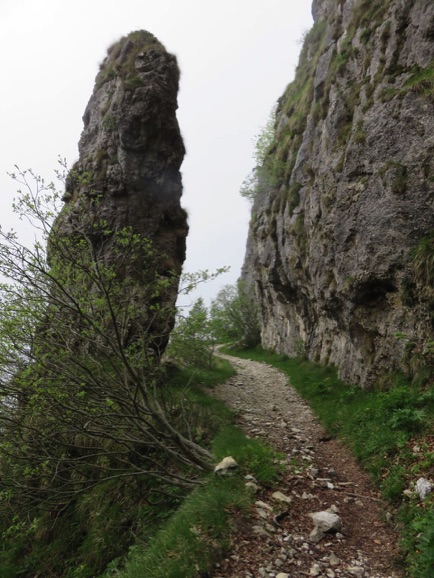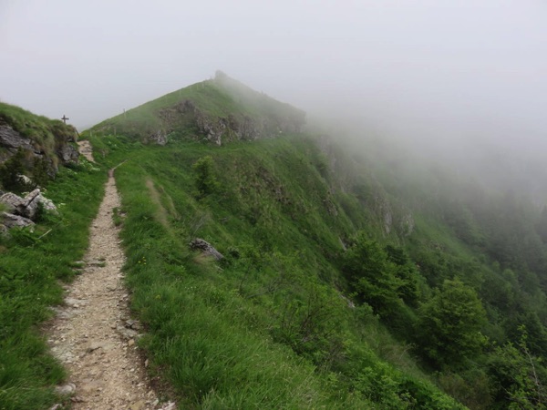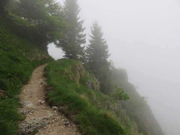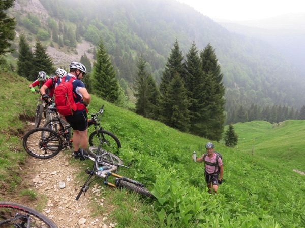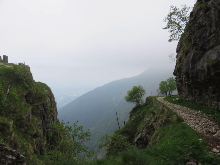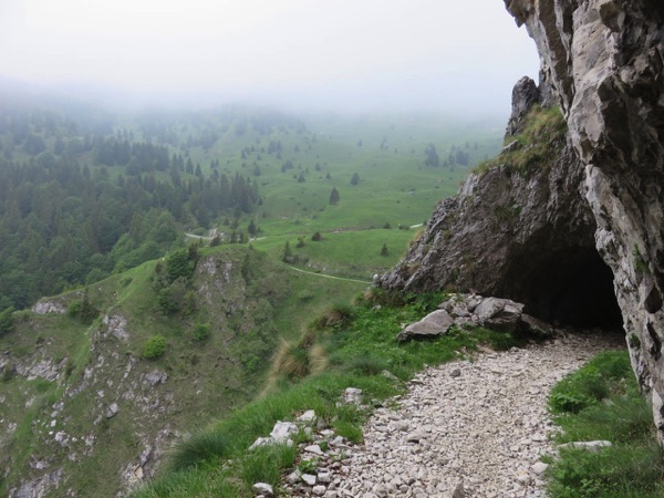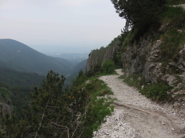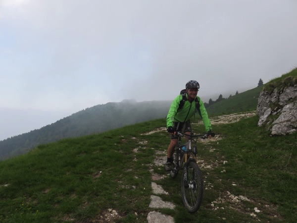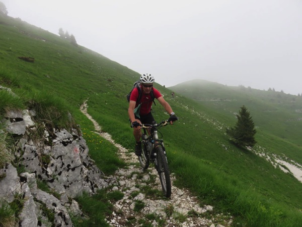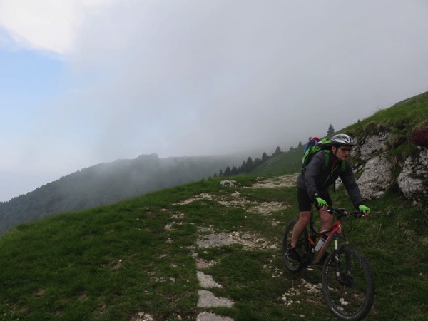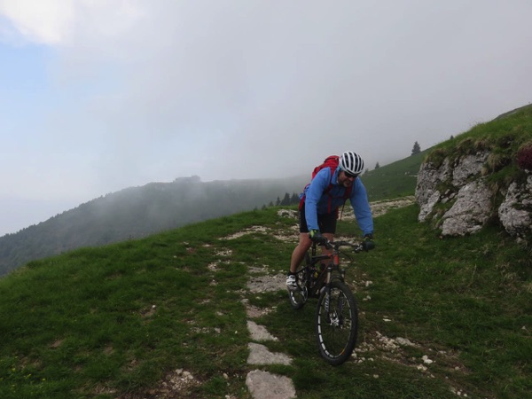 Von der unwürdigen Auffahrt des Tete de la Course auf der (schon erwähnt?) einfachen und anspruchslosen Asphaltstraße gibt es zu Recht keinerlei Aufzeichnungen und so muss der geschätzte Betrachter dieser Dokumentation mit den herrlichen Aufnahmen von Günther auf dem Sentiero 152 Vorlieb nehmen. Wunderschön zieht sich der Wanderweg entlang eines Bergrückens hinüber Richtung Monte Grappa, tolle Felsformationen inklusive. Nach kurzer Abfahrt geht es dann aber äußerst knackig auf einem schmalen Weg weiter, bei einer kurzen Abfahrt überschlägt sich Günther aus Unachtmerksamkeit und kullert eine steile Wiese hinunter. Unglücklicherweise schlägt das Navi auf einem Stein auf, Display kaputt! Und die Trinkflasche bleibt auch vorerst unbemerkt liegen, schön blöd, es ist noch eine Stunde zu fahren...