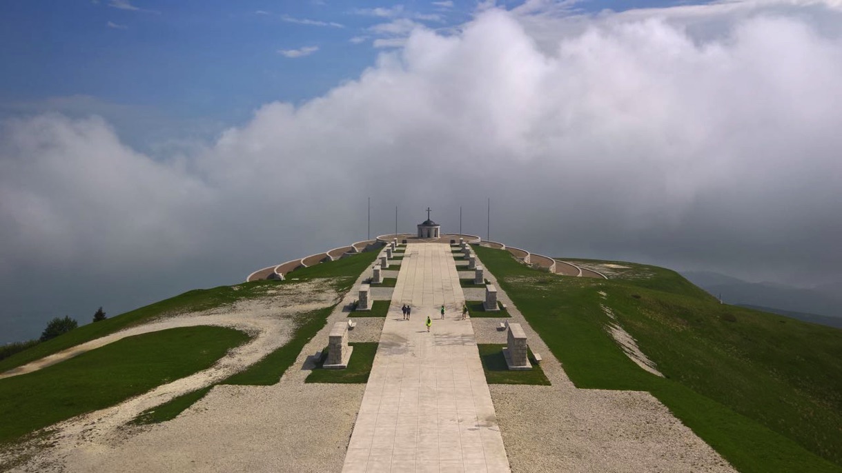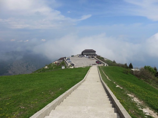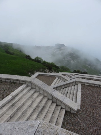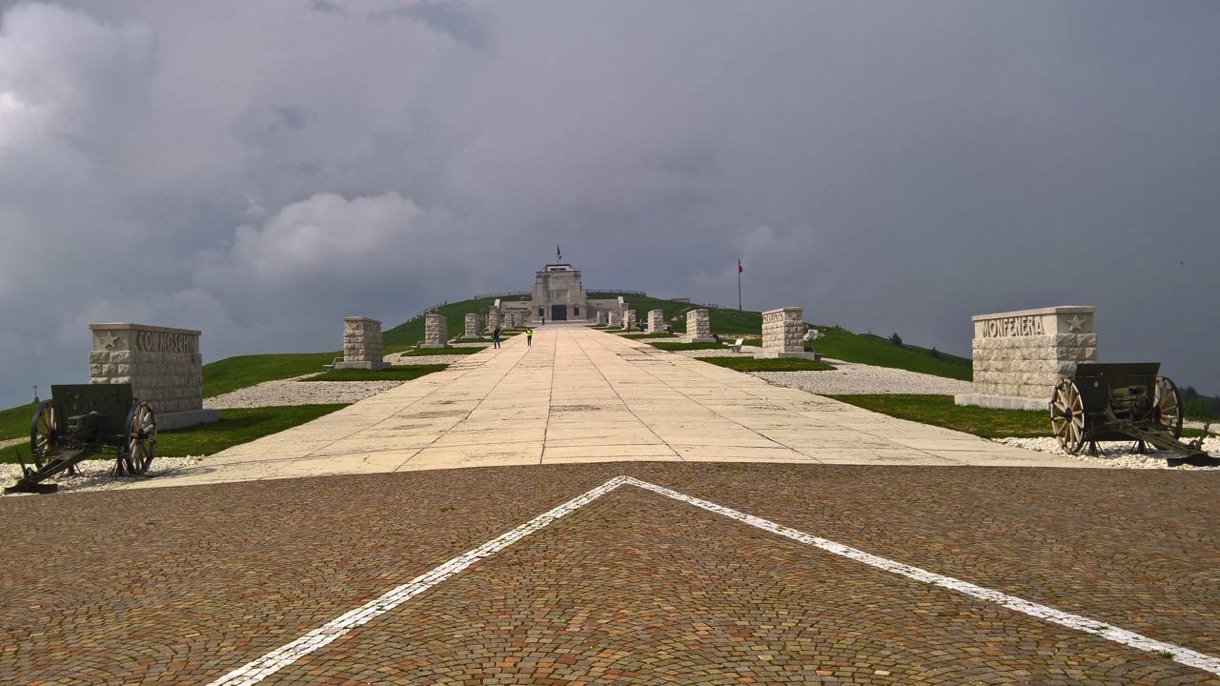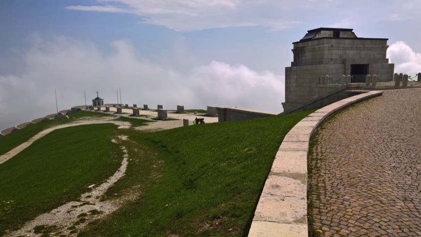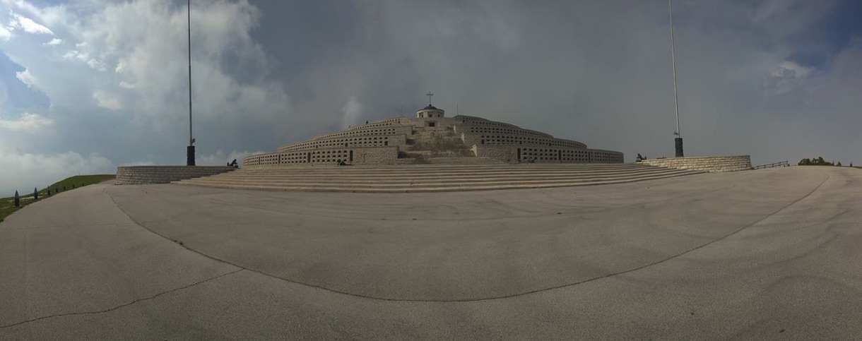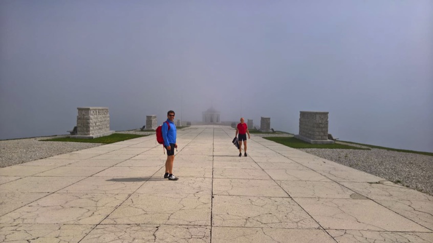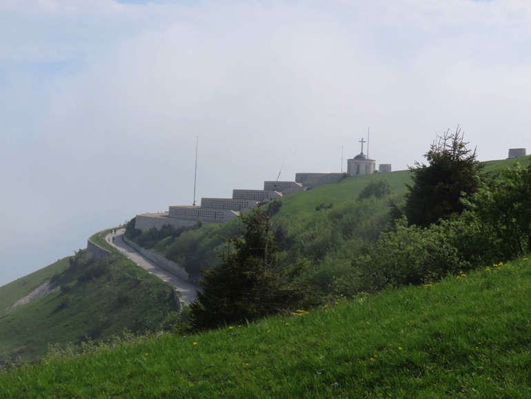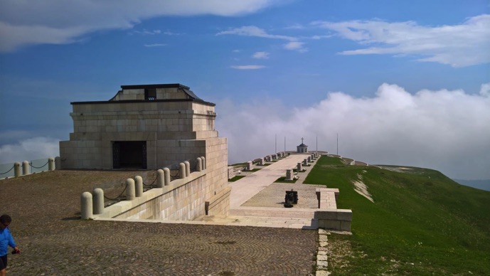 Großartig dann weiter oben der Blick hinüber zum Rifugio Monte Grappa mit seiner beeindruckenden Gedenkstätte. Der große Ansturm aufgrund des Monte Grappa Bike Days ist bereits vorüber, wir bekommen dennoch eine gute Lasagne. Danach erfolgt wieder eine kurze Besichtigung der monumentalen Anlage.