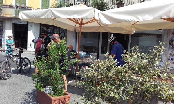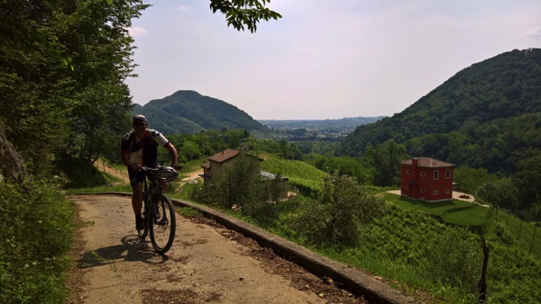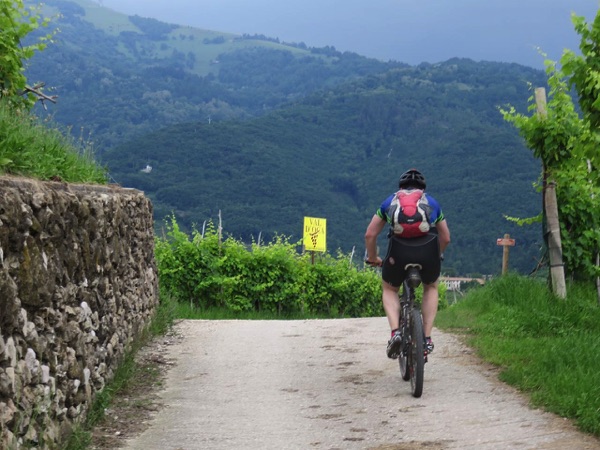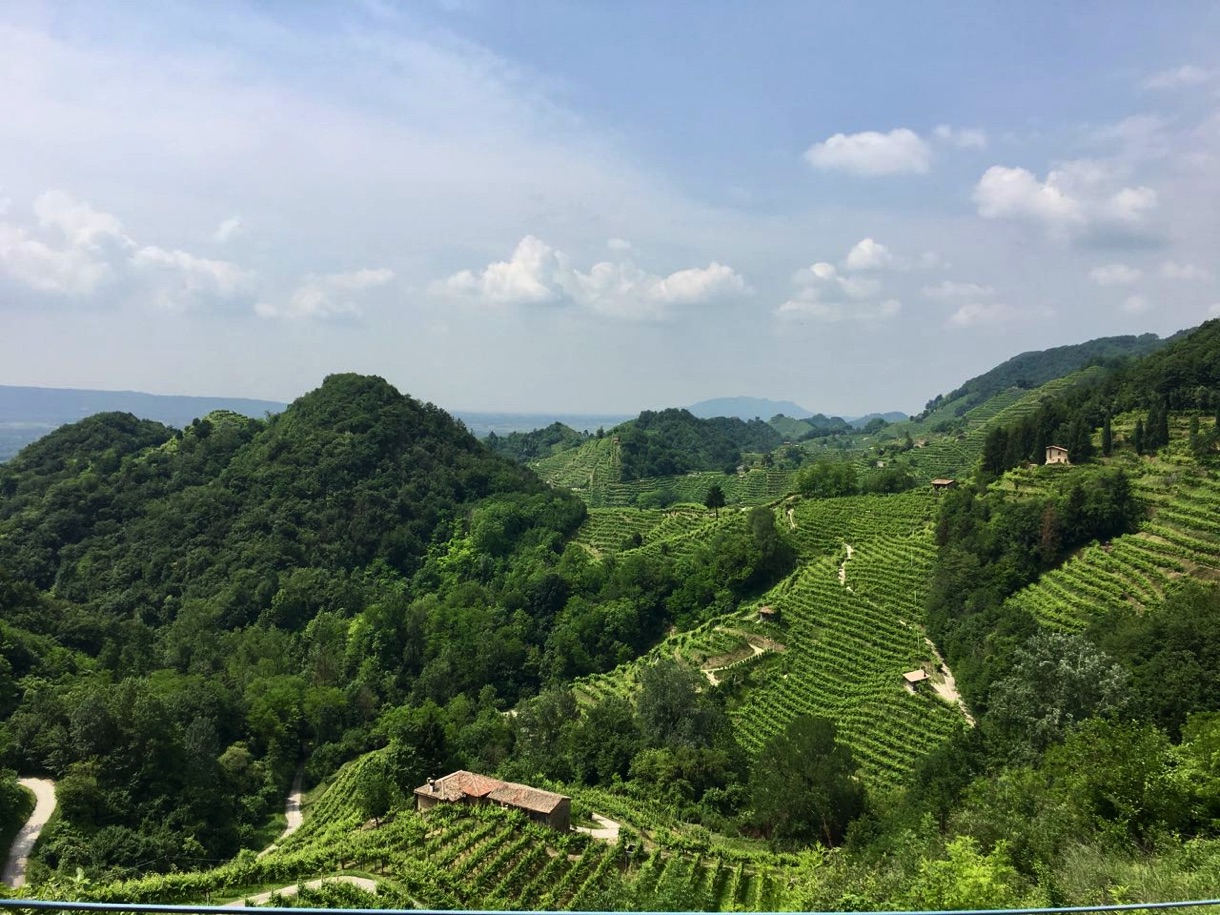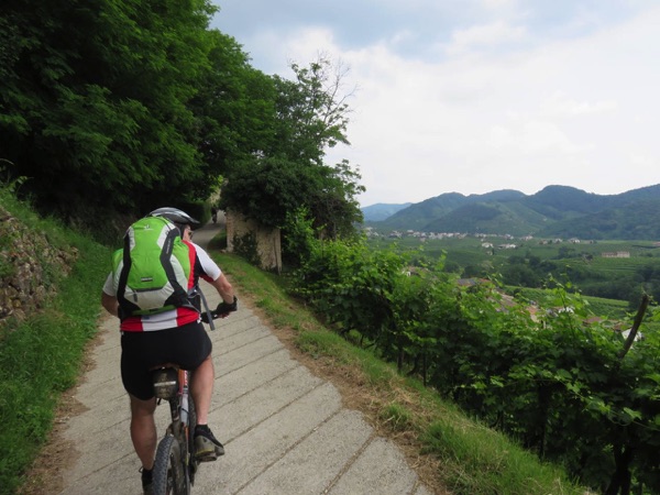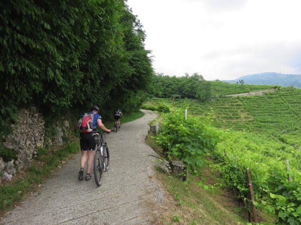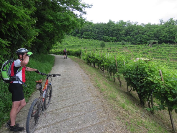 In Sernaglia nehmen wir den ersten Cafe zu uns, weiter geht es über schöne Radwege bis Pieve di Soligo. Etwas nördlich davon biegen wir nach Westen ab, aber vor allem nach oben. Fast senkrecht zieht sich die Betonstraße hinauf in die Weinberge, wunderschön aber hart. Auf schönen Wegerl geht es hinüber bis auf die Höhe von Farra di Soligo, immer wieder mit herrlichem Blick hinein in die idyllisch gelegenen Weinberge.