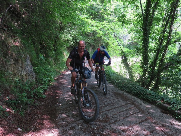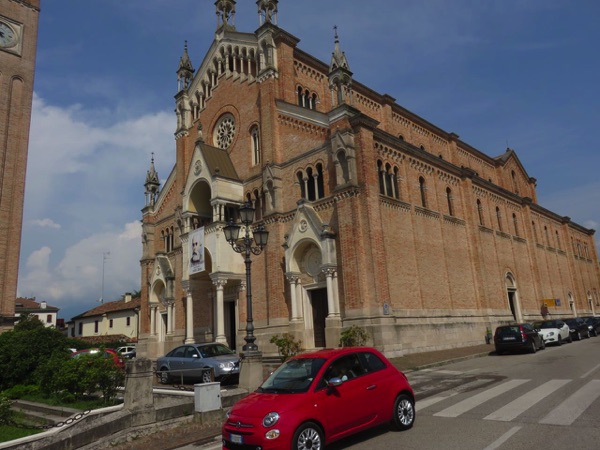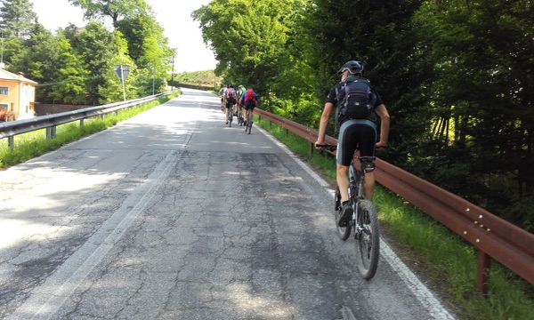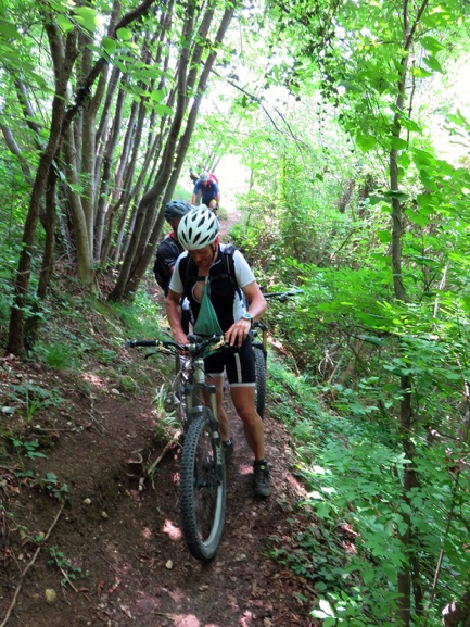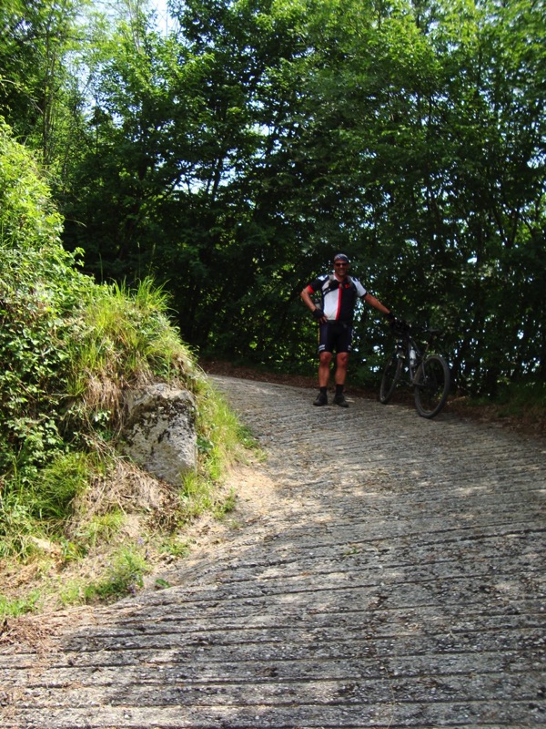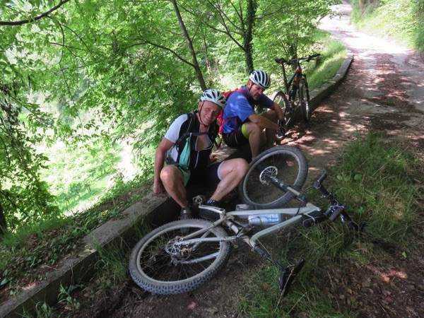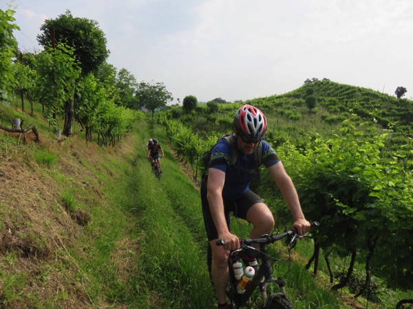 Bei einem schönen Kircherl ist dann auf einmal ein großer Volksauflauf, etwa eintausend Italiener haben sich mit Proseccogläsern und Flaschen bewaffnet in die Weinberge begeben und ziehen von Essens-Standerl zu Trink-Standerl - la vita e bella! Es ist heiß, wir sind mit unseren Kräften am Ende und entschließen uns zur Abfahrt hinunter ins Tal nach Farra di Soligo. Dort finden wir rasch eine gute Pizzeria und stärken uns für die letzte Etappe hinüber nach Valdobbiadene. Mehr oder minder gemütlich geht es dann über herrliche Hügerl zurück zu den Autos und am Schluß gibt es noch einen super steilen Schlußanstieg - was will man mehr!
