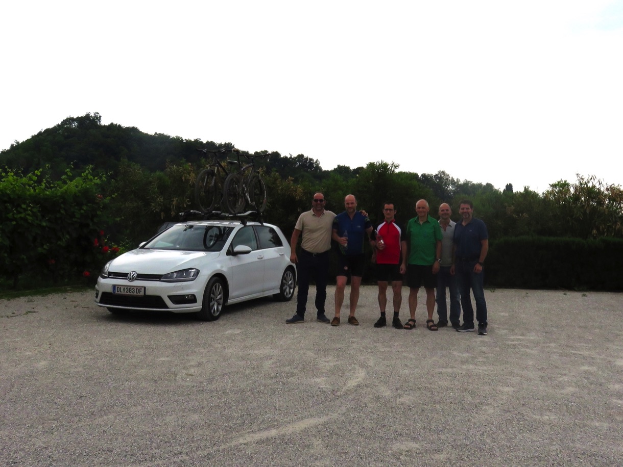 Frühstück bereits ab 07:30, schließlich wollen wir heute auch noch heimfahren. Wir bezahlen und beladen die Autos sofern dies aufgrund der zahlreichen Prosecco Kartons überhaupt noch möglich ist, denn auch das Weingut Vedova hat ein ausgezeichnetes Tröpferl anzubieten. Leider sind alle Zimmer ausgebucht, sodass wir am Ende der heutigen Etappe nicht mehr in unseren Zimmern duschen können - so wird es wohl der Wasserschlauch werden. Wir rollen anfangs gemütlich durch Weinberge und danach über viele blühende Wiesen, herrliches Genussradeln pur!