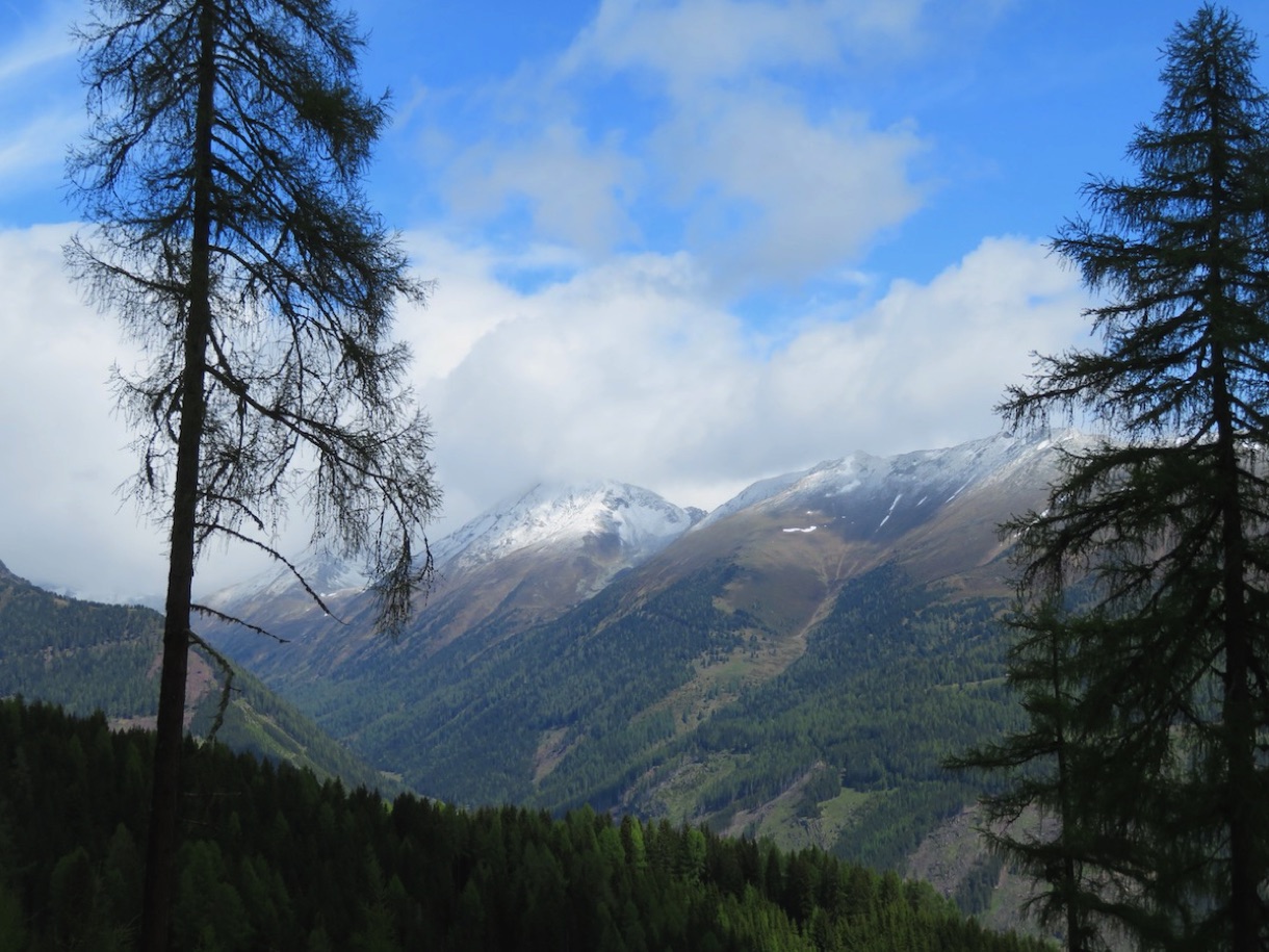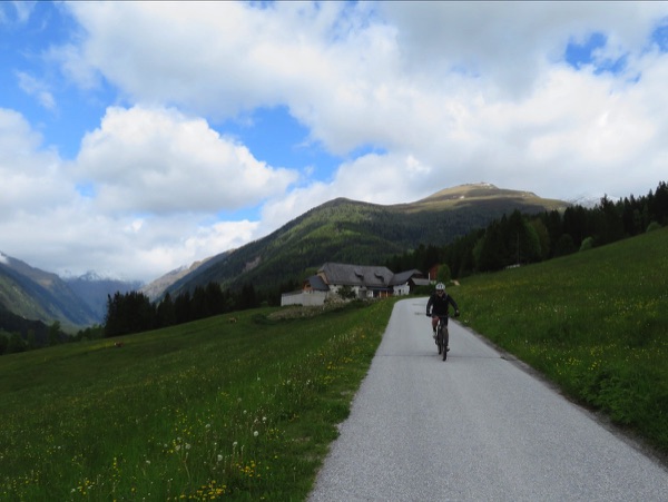 Einen kurzen aber deswegen noch lange nicht leichten Stich später sind wir auf der nächsten Passhöhe und rasen hinunter ins Tal nach Lessach, wunderbare Einblicke in die umgebende Bergwelt inklusive. Unten im Tal angekommen geht es dann rechts hinauf ins Hintere Lessachtal, beeindruckend die schneebedeckten Gipfel ringsum. Wir biegen links ab und beginnen die knackige Auffahrt hinauf zur Karneralm.