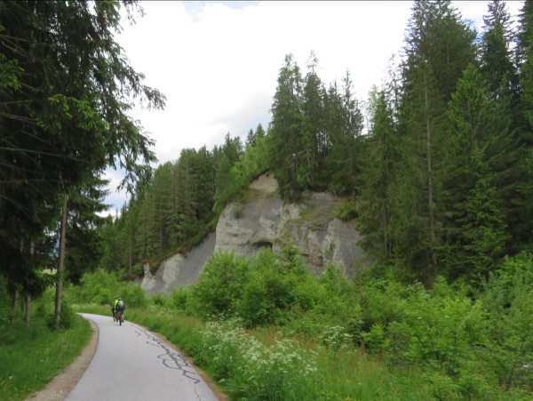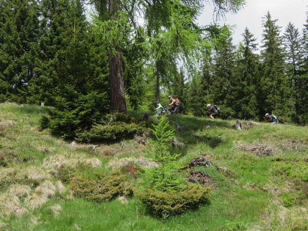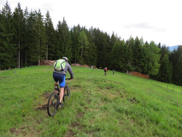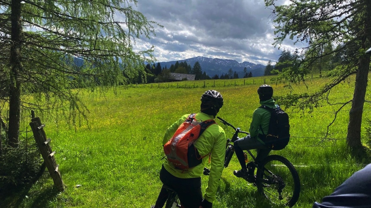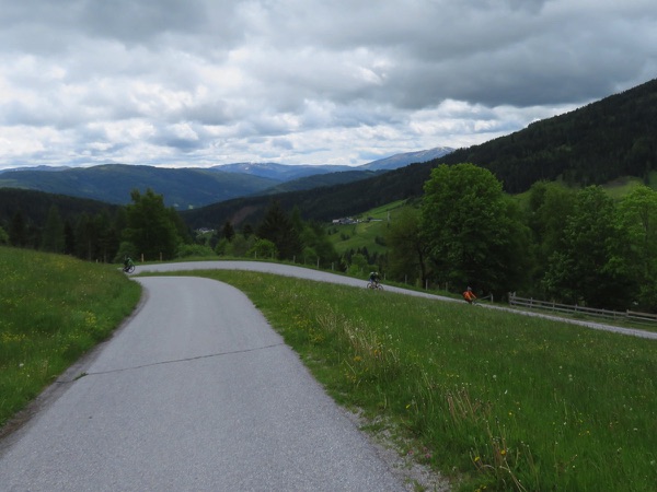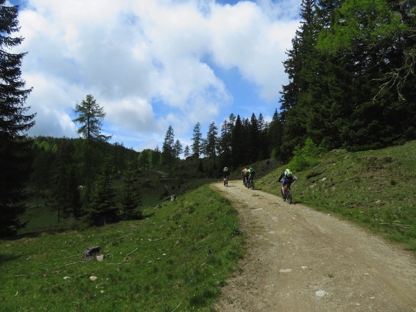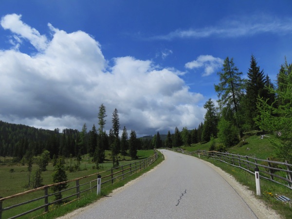 Der Weg ist ganz gut fahrbar und so geht es zügig voran auf 1700m hinauf, gefolgt von einer rasanten Abfahrt hinunter auf die Bundesstraße. Wir sind kurz in der Steiermark und fahren bei durchaus beachtlichem Gegenwind hinauf zum Prebersee wo wir bei der gut gelegenen Ludlalm eine längere Pause samt Rindfleischsuppe machen.