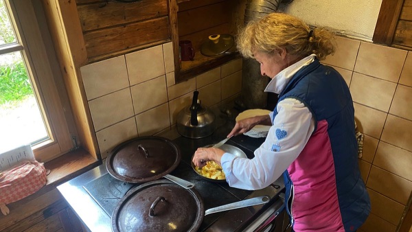 Oben angekommen graupelt es fast schon ein bisschen, es riecht nach Schnee und entsprechend erfroren kommen wir nach kurzer Abfahrt bei der schönen Wildbachhütte an. Die Wirtsleute verwöhnen uns mit allerlei warmen Speisen und Getränken, besonders erwähnenswert hierbei der grandiose Kaiserschmarren aus dem gusseisernen Pfandl, diesen kann man einfach nur als himmlisch bezeichnen.