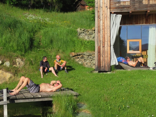 Bei herrlichem Wetter geht es weiter Richtung Tamsweg, immer auf einem schönen Radweg der malerischen Taurach entlang. Wir durchqueren schönstens gepflegtes Kulturland der Extraklasse, immer mit einem tollen Ausblick in die umgebende Berglandschaft. Franz kauft sich noch einen Liter flüssiges Gold für seinen etwas waidwunden BMW und bei der Ankunft im Smart Wood House genießen wir auf der Wiese liegend den herrlichen Sonnenschein bei ein zwei gepflegten Bieren.