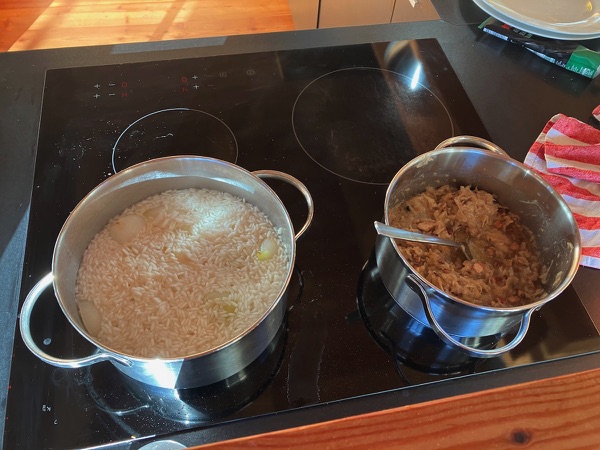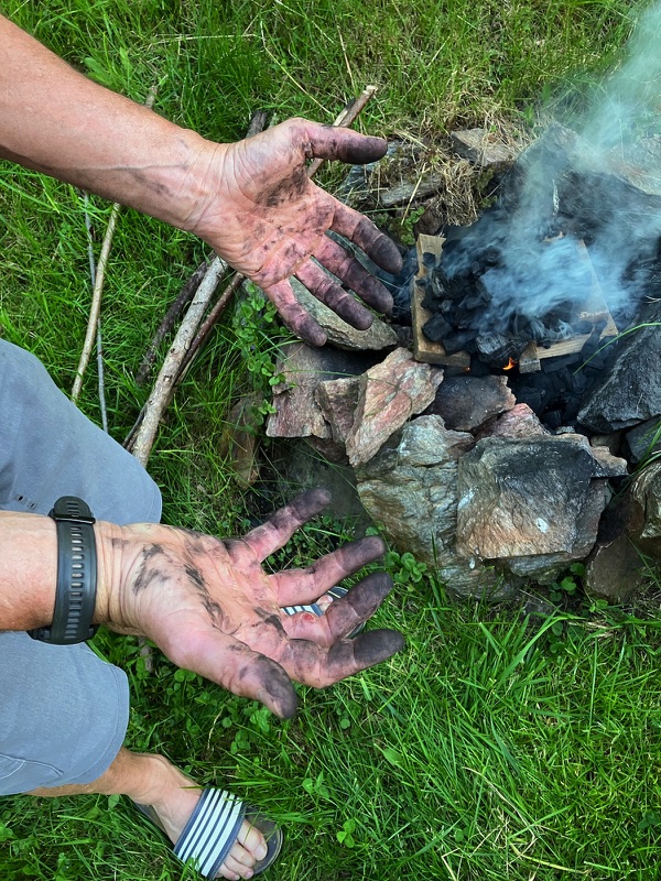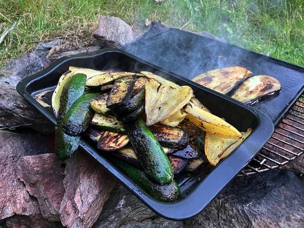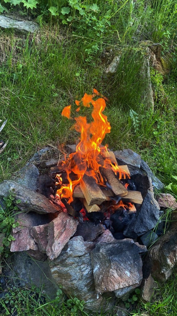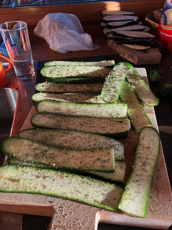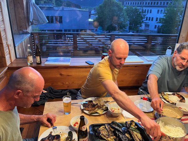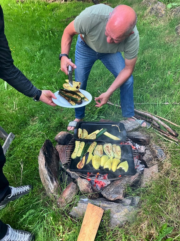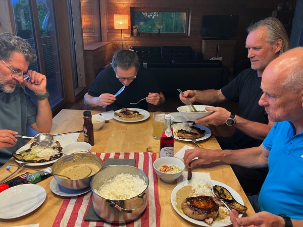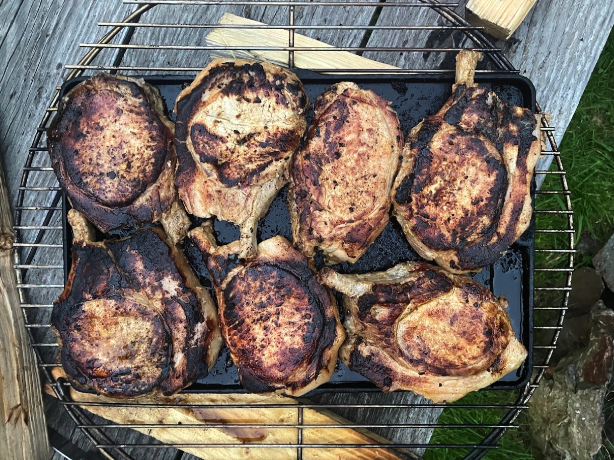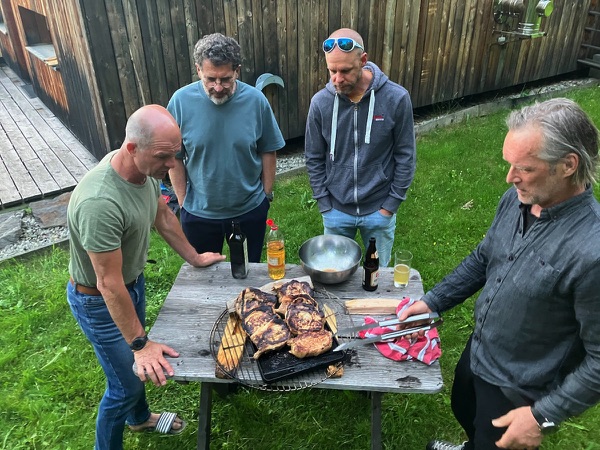 Abends gibt es dann ein großartiges BBQ-Feuerwerk mit sieben gewaltigen Edel-Duroc-Kotelette der allerfeinsten Güte samt einer Unmenge an Zutaten. Wie sieben Lausbuben stehen wir um das Feuer und erfreuen uns an diesem archaischen Erlebnis. Zuerst biegen sich die Tische, dann die Bäuche. Eine gute Flasche Rotwein schließt die müden Augen.