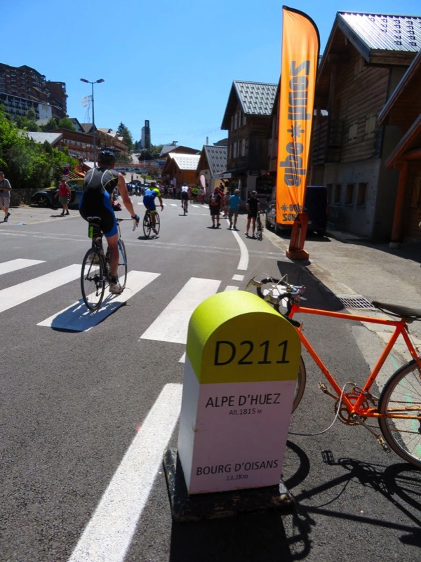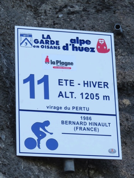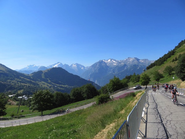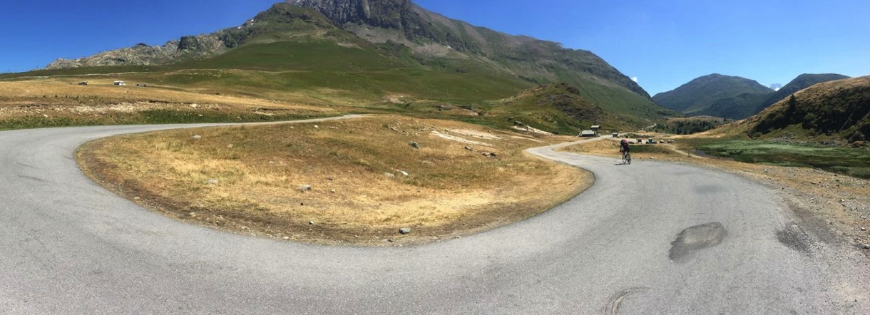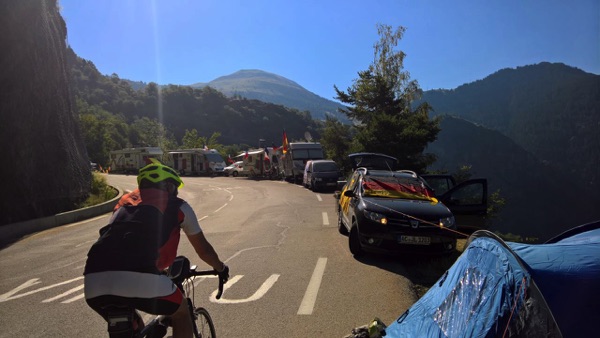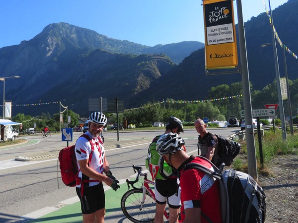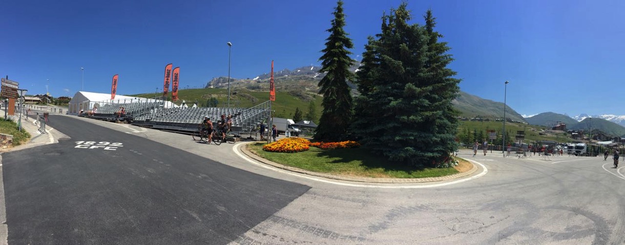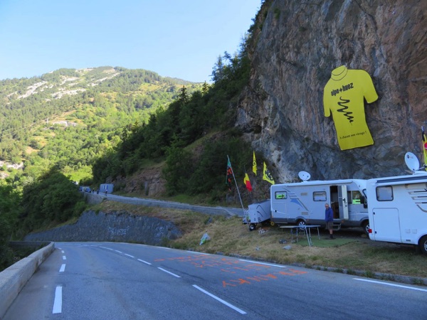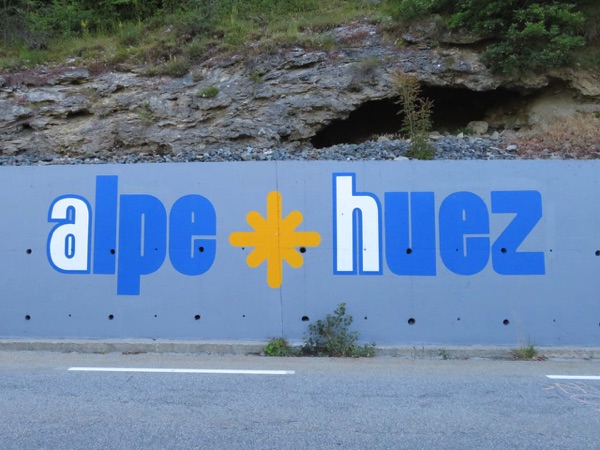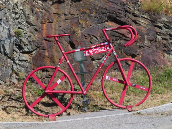 Der Berg begrüßt uns mit Sonnenschein und einer ordentlichen Rampe, die ersten beiden Kilometer sind wirklich zach, kein Wunder dass sich hier schon so manche Tour de France Etappe oder sogar das ganze Rennen entschieden hat. Wir fahren gemeinsam mit gefühlt tausenden anderer Radfahrer hinauf, viele Wohnmobile sind schon optimal positioniert, Volksfeststimmung überall, einfach grandios. Wir lassen uns etwas mehr Zeit als die Profis den nicht gerade sehr schmucken Schiort Alpe d‘Huez mit all seinen Hotelburgen zu erreichen. Oben angekommen gibt es ein gutes Mittagessen und die verdiente lange Rast.