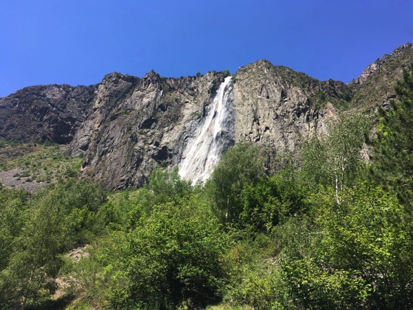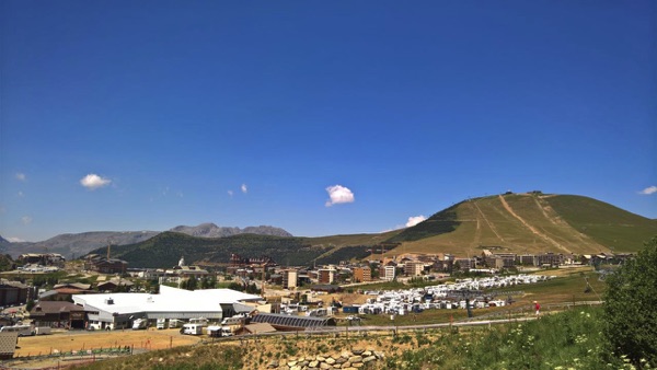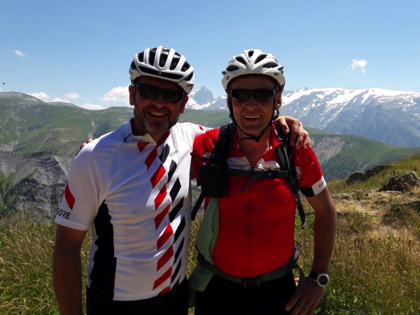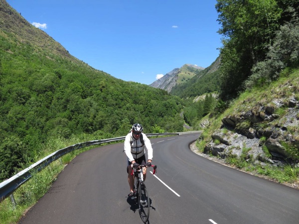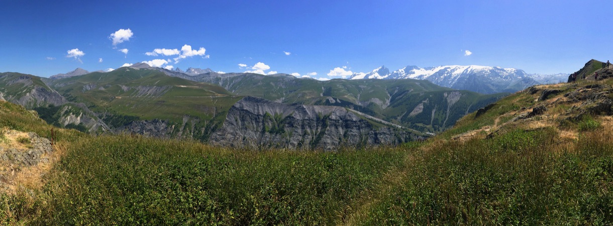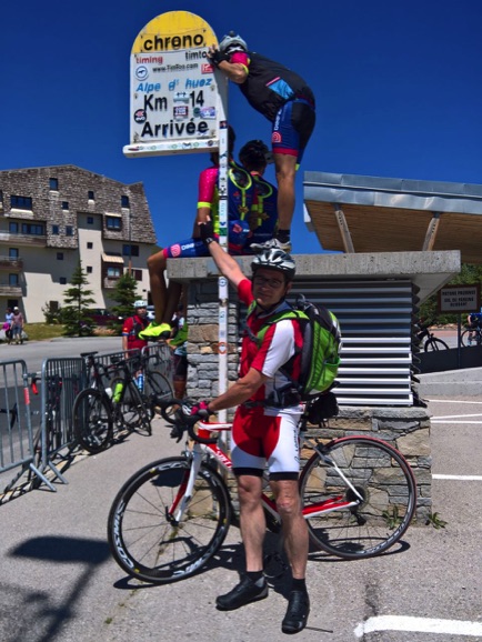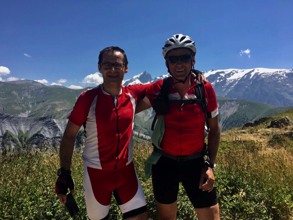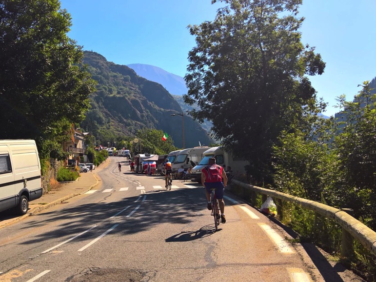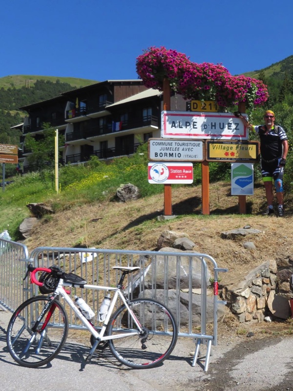 Der Berg begrüßt uns mit Sonnenschein und einer ordentlichen Rampe, die ersten beiden Kilometer sind wirklich zach, kein Wunder dass sich hier schon so manche Tour de France Etappe oder sogar das ganze Rennen entschieden hat. Wir fahren gemeinsam mit gefühlt tausenden anderer Radfahrer hinauf, viele Wohnmobile sind schon optimal positioniert, Volksfeststimmung überall, einfach grandios. Wir lassen uns etwas mehr Zeit als die Profis den nicht gerade sehr schmucken Schiort Alpe d‘Huez mit all seinen Hotelburgen zu erreichen. Oben angekommen gibt es ein gutes Mittagessen und die verdiente lange Rast.
