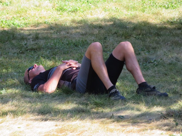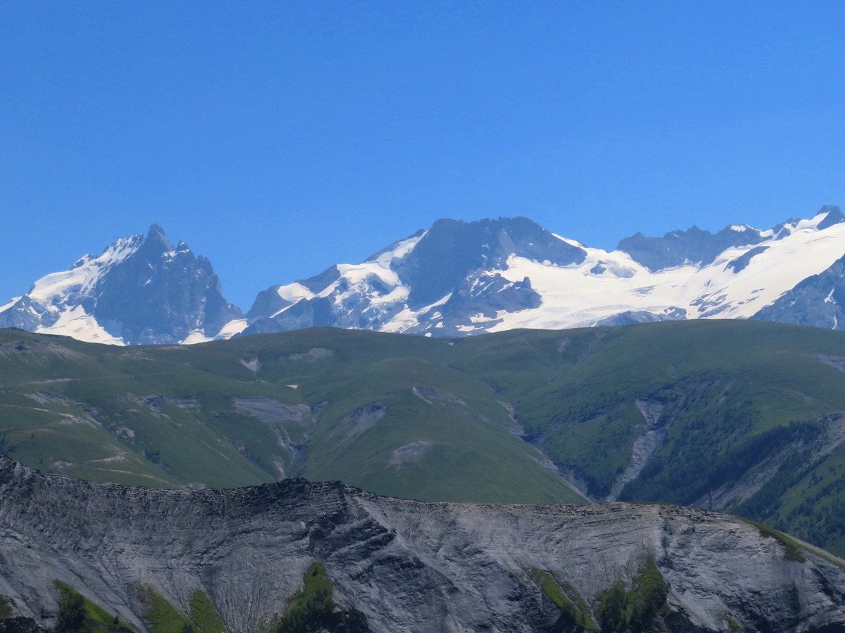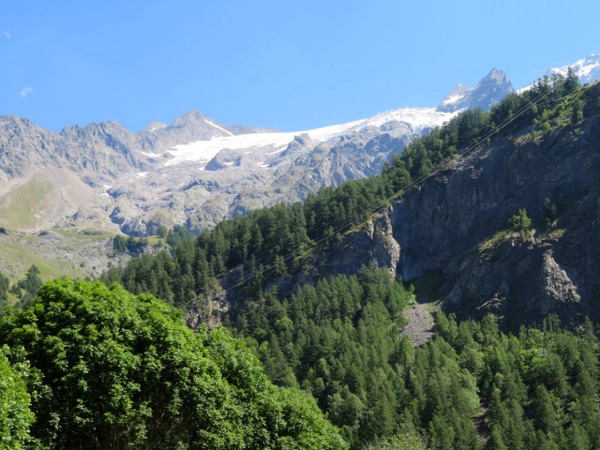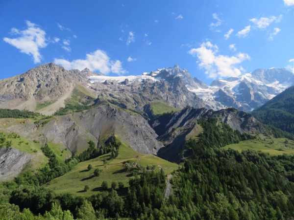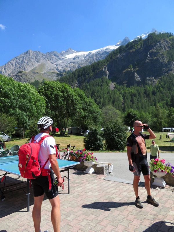Die rasante Abfahrt endet abrupt am Stausee Lac du Chambon. Wir verwerfen die ursprüngliche Planung südlich des Stausees zu fahren, denn hier scheint die Straße gesperrt zu sein. Also nehmen wir die gut ausgebaute Regionaltraße hinauf zum Col du Lautaret. Es ist brütend heiß und die Steigung will und will nicht abreissen. Nur mit viel Überwindung erreichen wir einen Campingplatz kurz vor Le Grave mit tollem Blick hinauf in die Gletscherwände des La Meije inmitten des Ècrins-Massivs. Bilder sagen meist mehr als Worte, dies gilt sowohl für die Schönheit der umliegenden Bergwelt als auch für den Zustand des Peloton.