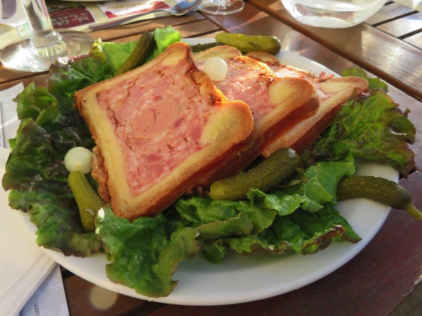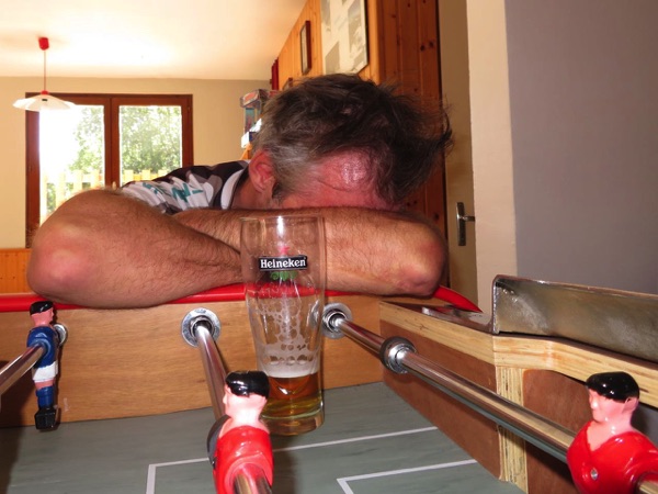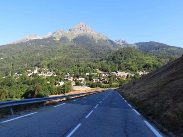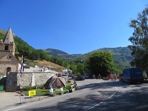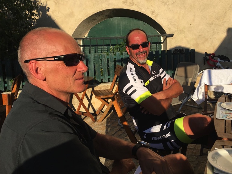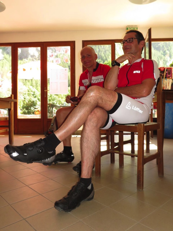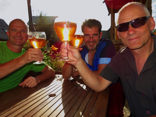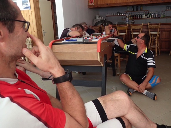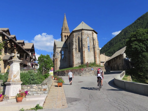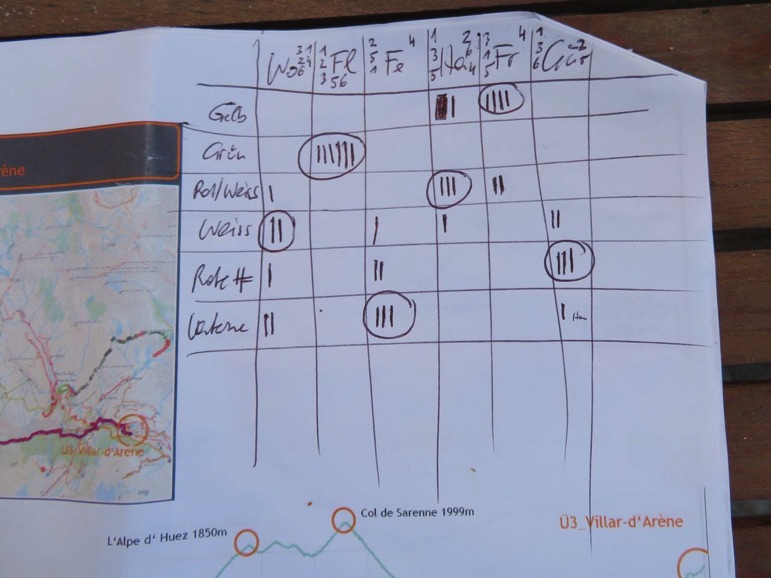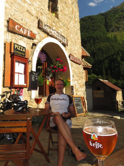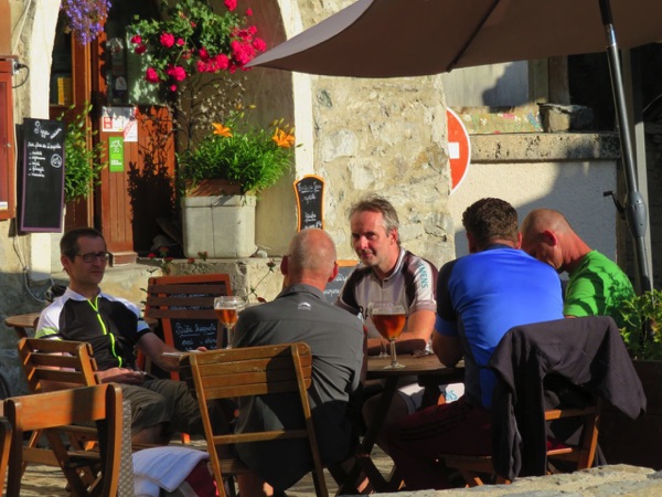 Die letzten 150Hm hinauf nach Villar d‘Arene gehen dann auch noch irgendwie, wir rollen in das abgelegene ruhige Bergdorf mit seiner Steinkirche und dem Kirchenwirten Les Melezes, dem wir sogleich die Aufwartung machen. Selten hat ein Bier nach einer Etappe so gut geschmeckt, dass danach folgende Abendessen sucht immer noch seinesgleichen, auch in Frankreich. Bis lange nach Sonnenuntergang (21:00) genießen wir den lauen Abend und die schöne Atmosphäre in diesem malerischen Ort. Zum Abschluß wird unter dem Einfluss von größeren Mengen des vorzüglichen Hausweins noch die Tageswertung besprochen, Silberrücken Franz hat den heutigen Tag eindrucksvoll dominiert und sichert sich damit das Gelbe Trikot für den morgigen Tag.