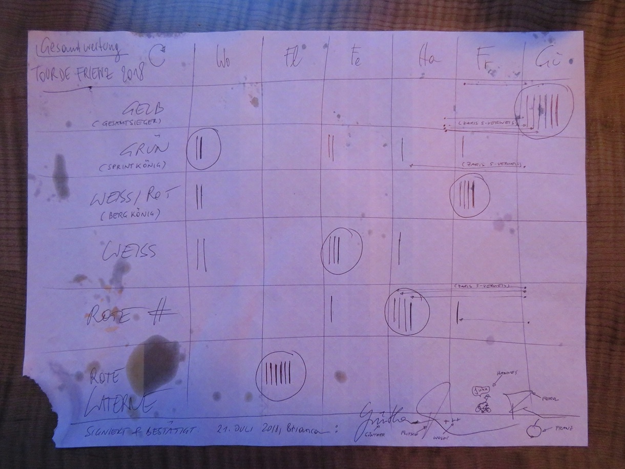 Trotz härtestem Wettbewerb haben alle liftfahrenden Teilnehmer in einer mehr als demokratischen Abstimmung einstimmig den nicht-liftfahrenden Günther zum Träger des Maillot Jaune ernannt. In Anbetracht seiner erbrachten fahrerischen Leistungen wird er somit doch etwas überraschend zum Gesamtsieger dieser Rundfahrt gekürt. Von Schiebung freilich keine Spur, die freiwilligen Unterschriften beweisen den einstimmigen Beschluss!