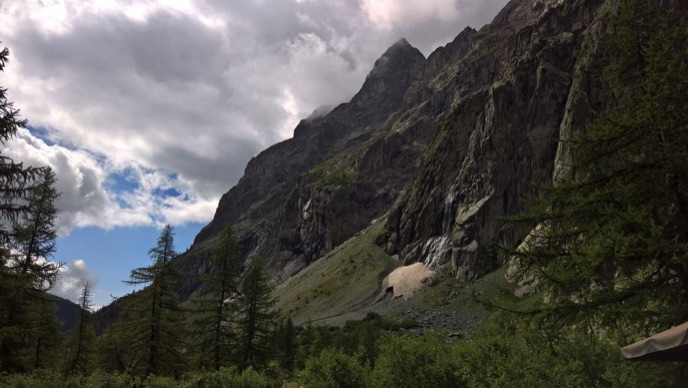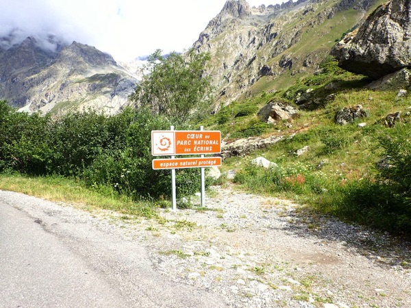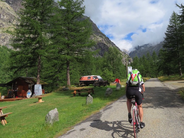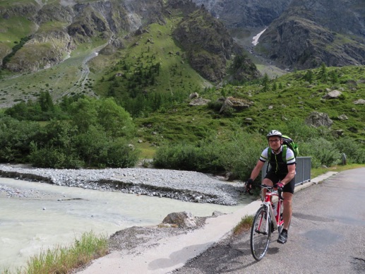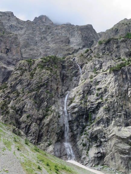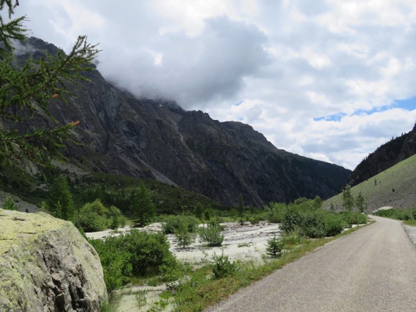 Von dort aus geht es etwas knackiger mehr als 600 Höhenmeter weiter, über eine gut ausgebaute Straße geht es hinein in den wunderschönen Talschluß vom Mont Pelvoux. Mitten im Nichts dann ein großer Campingplatz, es handelt sich scheinbar um ein gut besuchtes Kletter-Eldorado. Weiter oben ist die Straße dann quasi verkehrsfrei, herrliches Genussradeln bis hinauf zum obersten wildromantischen Plateau in das sich hohe Wasserfälle ergießen.