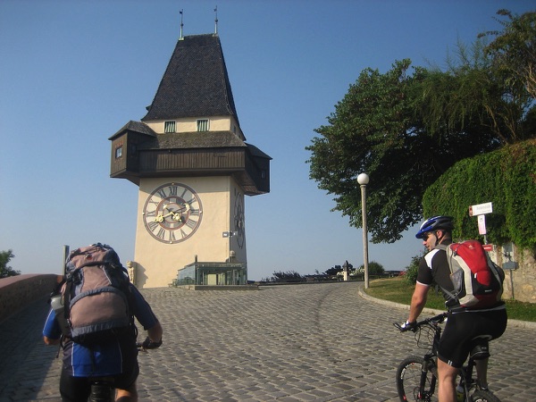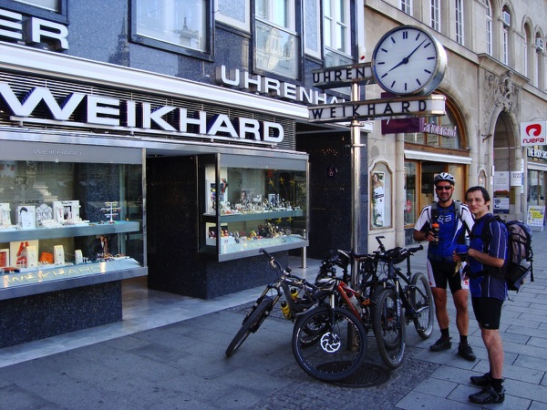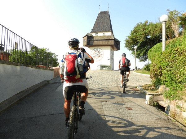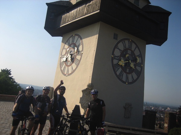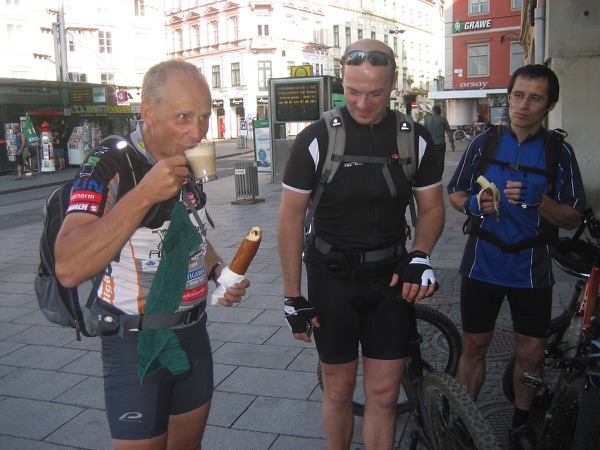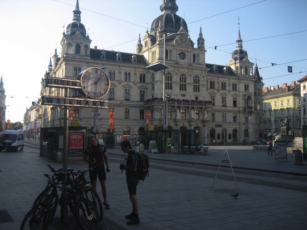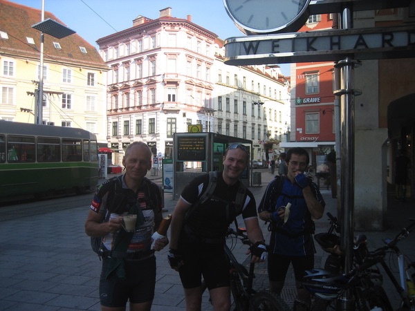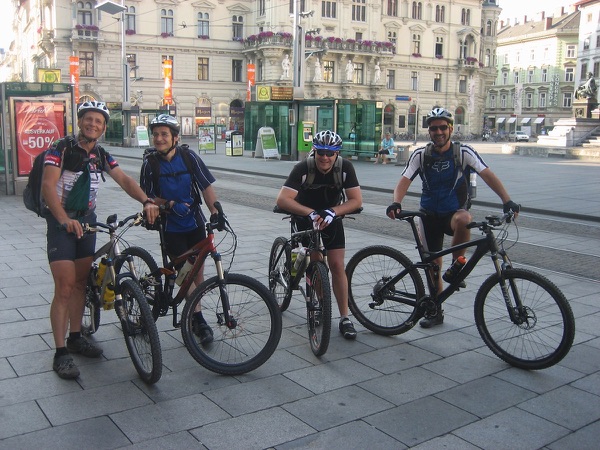 Treffpunkt um 08:00 am Grazer Hauptplatz, Franz, Wolfi, Mario, Günther, alle da, nur unser Kücken Georg hat Probleme mit seinem Hinterbau (bzw. mit dem seines Rades) und versucht verzweifelt in Eggenberg nach einer Radwerkstatt mit frühen Öffnungszeiten. Somit ist sofort klar: kein Prolog auf den Schloßberg für ihn = keine Chance auf die diesjährige Gesamtwertung! Wieder nicht, schade, zumal er sich ja beim Radfahren sonst immer wirklich sehr bemüht...