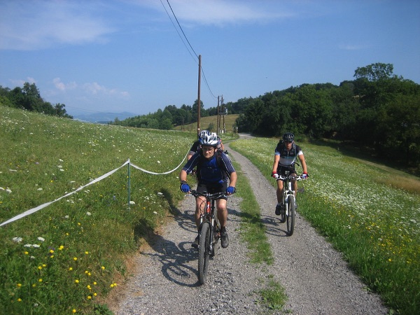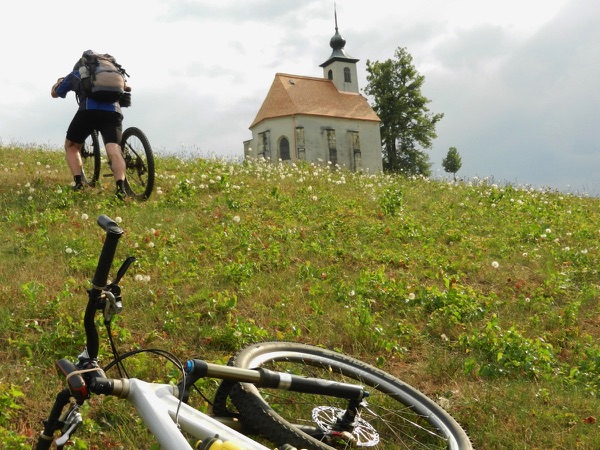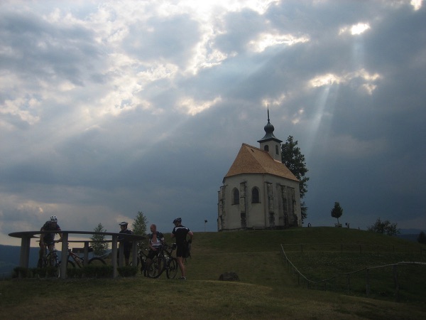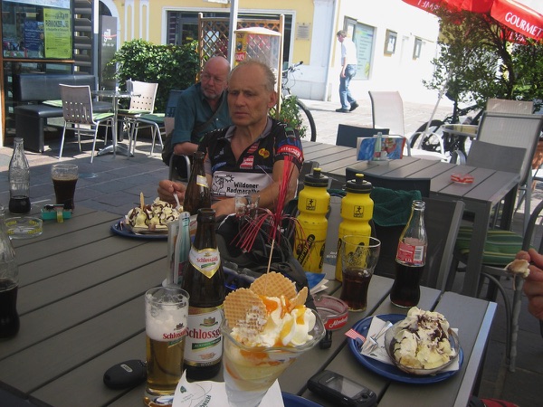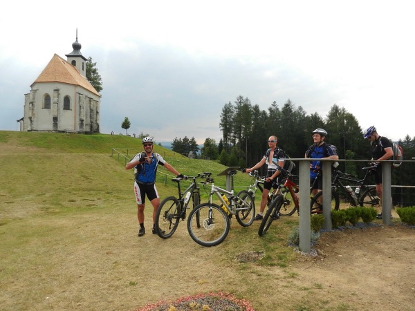 Also strampeln wir im Suppenkoma weiter nach Bad Gams und danach Richtung Deutschlandsberg, immer im Schatten von Hebalm und Weinebene, wobei man Schatten nicht so wörtlich nehmen darf, denn es war heiß. In Deutschlandsberg gibt es dann Eis mit 2x Patschenpicken. Wir erholen uns ein wenig, um dann recht gnadenlos Richtung Wolfgangi-Kirche hinaufzufahren/schieben. Wolfgangi-Kirche, Weststeiermark, ein Heimspiel für Wolfi, da lacht er. Mario und Günther kommen offensichtlich aus anderen Landesteilen...