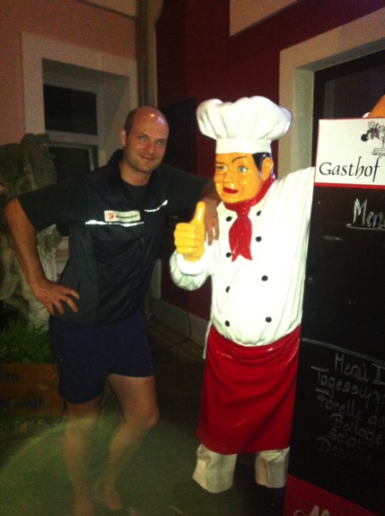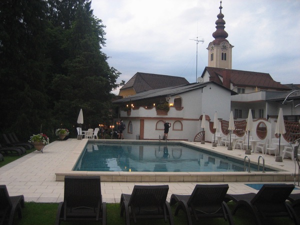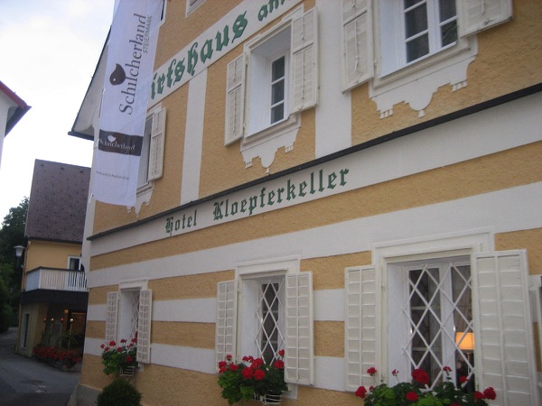 Dort fallen wir im Gasthof Klöpferkeller ein, herrlich mitten im Ortszentrum gelegen mit großem Pool und großen Fleischplatten und großen Zwicklbieren, Radfahrerherz was willst du mehr. Ein zwei Achterl bei der singenden Wirtin im Nebenlokal beendet den launigen Abend.
