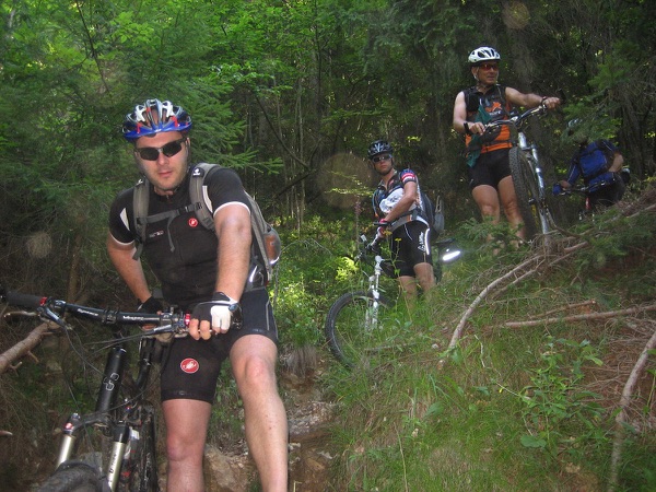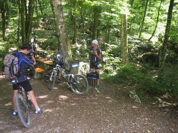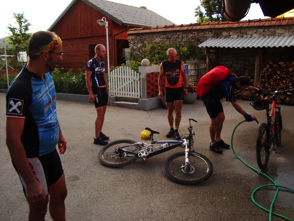 Gutes Frühstück um 06:30, Franz wechselt seine Bremsbelege, schließlich geht es nun gleich ordentlich rauf nach Sv. Miklauz, da müssen die Bremsen in Ordnung sein. Herrliches Wetter, schon morgens begleitet von Hitze und Schweiß. Die Abfahrt nach Senozetti ist dafür kühl aber nicht minder anspruchsvoll, wir gönnen uns einen guten Illy Caffe und versorgen uns mit dem Nötigsten für den heutigen Tag.