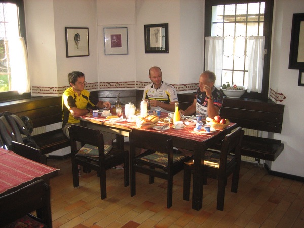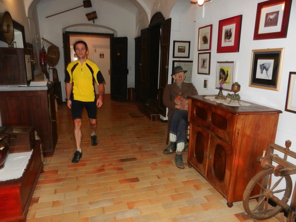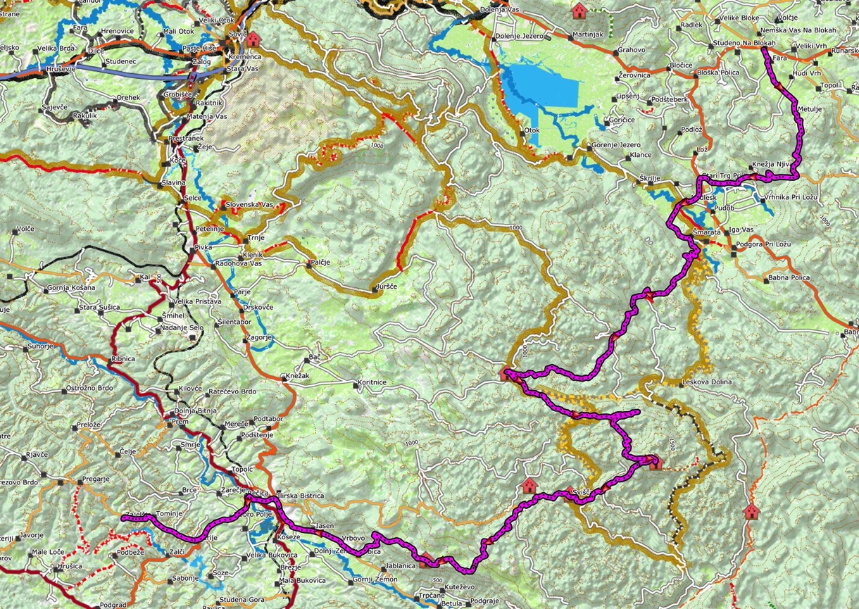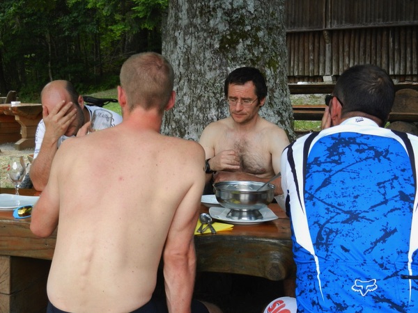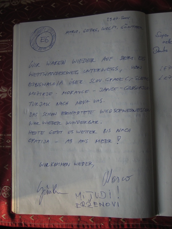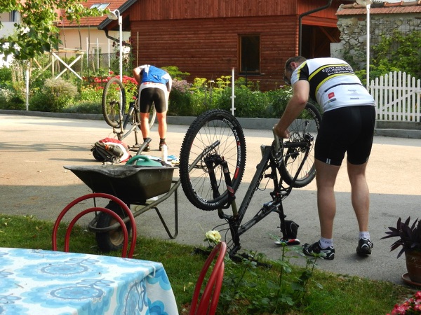 Es folgen viele traumhafte Abfahrten und einsame Single Trails, durchmischt mit rasanten und kurvigen Schotterpassagen. Irgendwie waren wir dann schon auf Ausrollen gepolt und ignorieren die feinen Details des Höhenprofils, eine wüste Schiebepassage hinauf zum letzten Zinken des heutigen Tages belehrte uns dann aber eines Besseren. Kurz vor Illirska Bistrica genehmigen wir uns noch ein Bier und nehmen Kontakt mit unserer Unterkunft auf, die Fahrt dahin wird dann noch einmal recht anstrengend und so kommen wir spät in unserem schlichten slowenischen Refugio an. Es handelt sich hier wirklich um ein Familienunternehmen, Oma kocht lecker Sauerkraut/Bohnen/Hartwurst, Mama und Tochter bedienen uns freundlich und nach reichlich Abendmahl samt guter Weinbegleitung beziehen wir unser individuelles Etablissement.