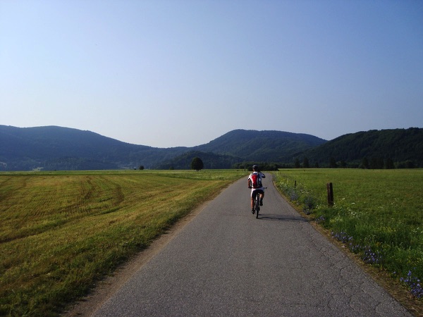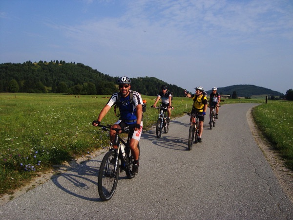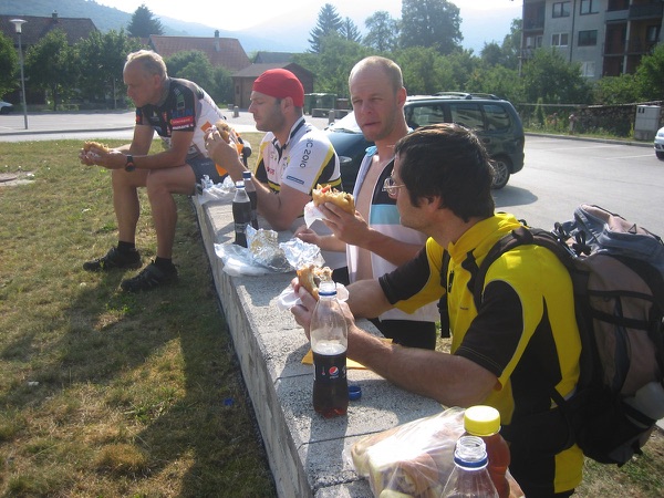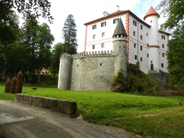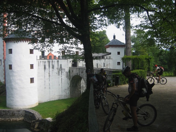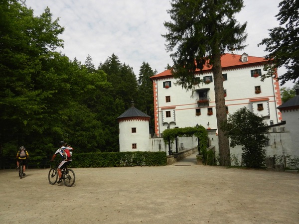 Frühstück ab 07:00, Abfahrt kurz nach 07:30 gefolgt von Genussradeln im Morgenlicht hinüber bis zum Schlangenweg. Oben schnaufend angekommen rollen wir gemütlich Richtung Stari Trg und finden mehr oder minder spontan die versteckte Einfahrt in den Single Trail, gefolgt von einem Abstieg von Georg. Der Weg ist schon recht stark verwachsen, wir leisten einen wertvollen Beitrag dass er wieder gut begeh- und befahrbar geworden ist. Dann geht es auf Schotter rasant hinunter bis Stari Trg auf ein Frühstücks-Kebab in der Morgensonne, die Speicher sind voll, auf geht‘s Richtung Schloß Sneznik, welches inzwischen mit Mitteln der Europäischen Union schön renoviert wurde.