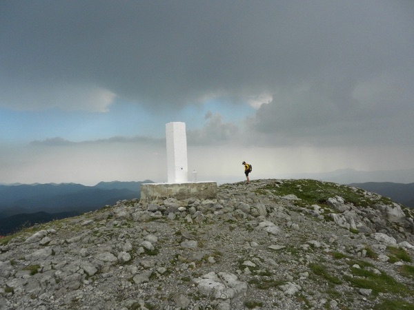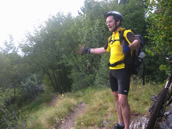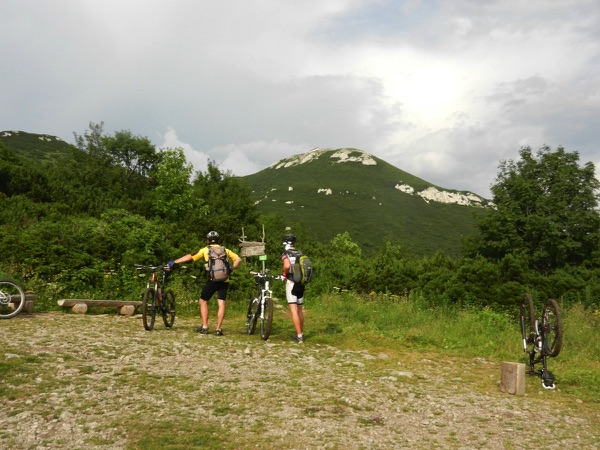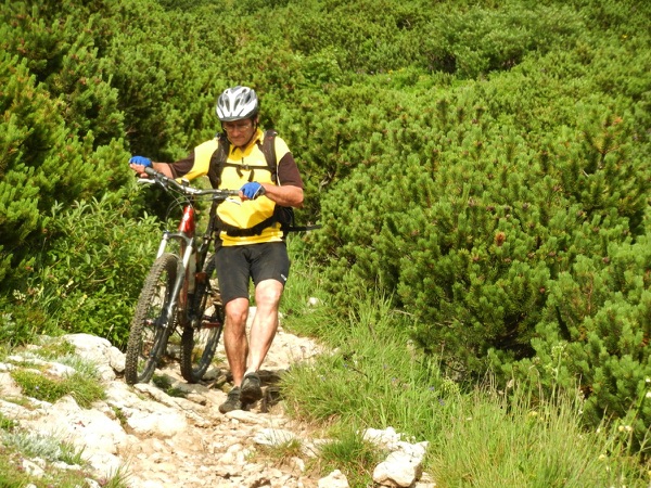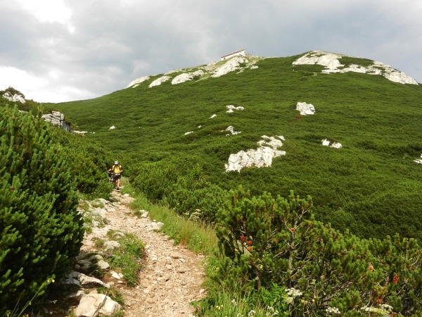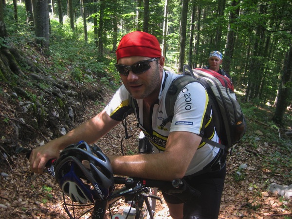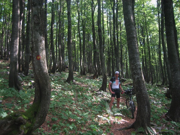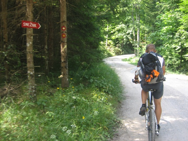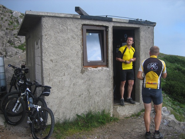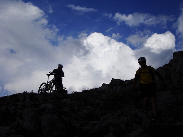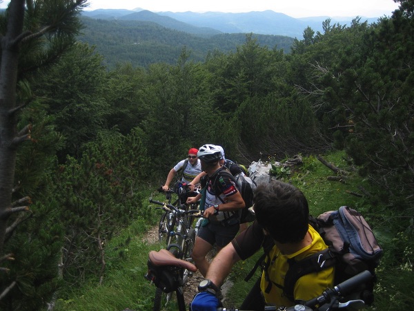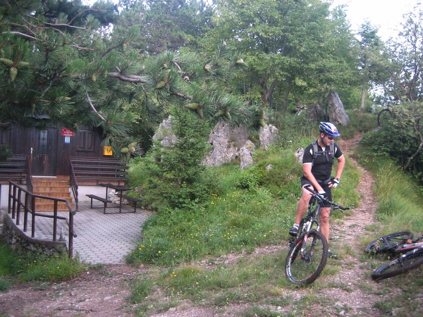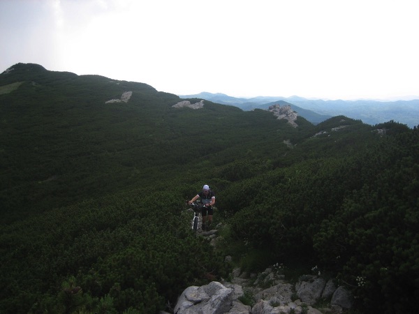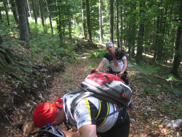 Nun folgt ein hartes Stück Arbeit, auf steilen Single Trails und dann auch auf meist recht gut fahrbaren Schotterstraßen geht es bis zum Abzweigung Richtung Sneznik auf ca. 1400m. Hier beginnt etwas was man im besten Fall als Wanderweg bezeichnen kann, manche (wie Robert Pracher und David Moser, welche die gleiche Tour ein paar Tage vor uns gemacht haben) würden es aber eher als Klettersteig bezeichnen und eine Begehung mit dem Fahrrad verweigern. Nicht so wir, wir nehmen die letzten 400 Hm hinauf zum Sneznik freilich auch noch mit, durch vom Schnee- und Winddruck verformte Buchenwälder und Latschen geht es teils schiebend, teils tragend hinauf Richtung Gipfel. Ober zieht ein Gewitter mit starken Windböen auf, wir retten uns in eine Notunterkunft, die Schutzhütte hat leider nicht geöffnet. Waagrecht aus unserer Behausung hinausgeworfene Bananenschalen landen am Dach des Hauses, so stark weht der Sturm. Nach 30 Minuten ist alles vorbei und wir können wieder abfahren, also dass Meiste halt (exklusive der ersten 200 Hm)...