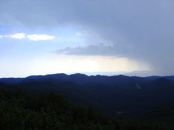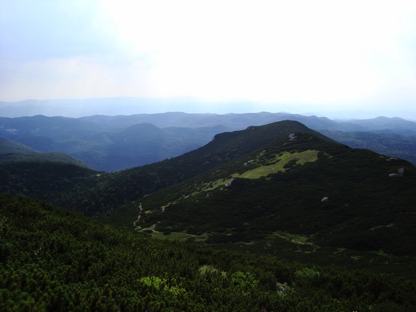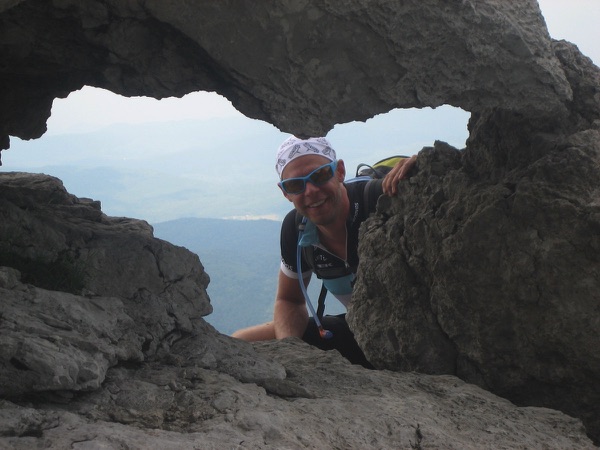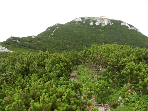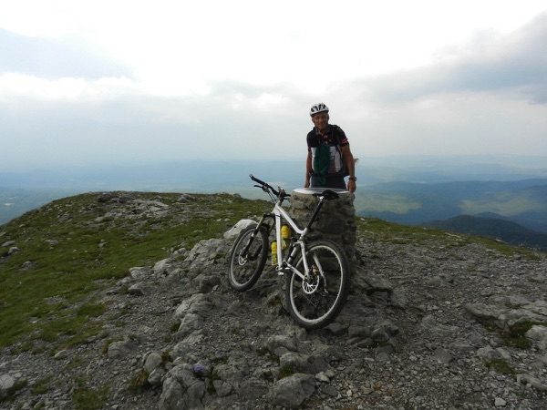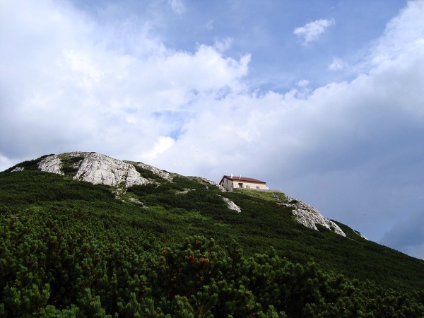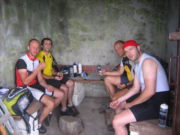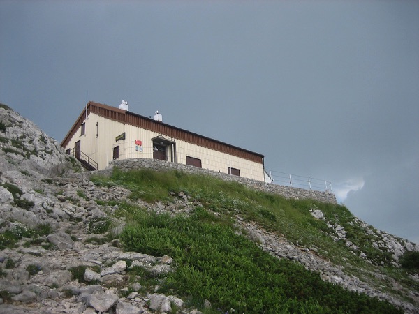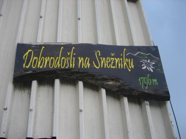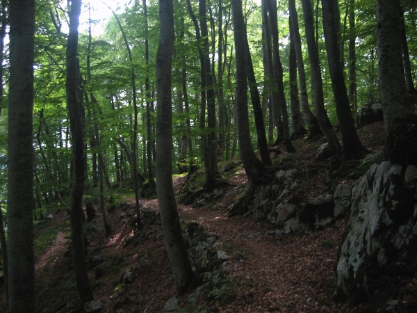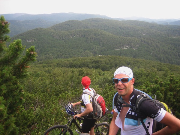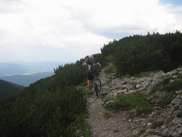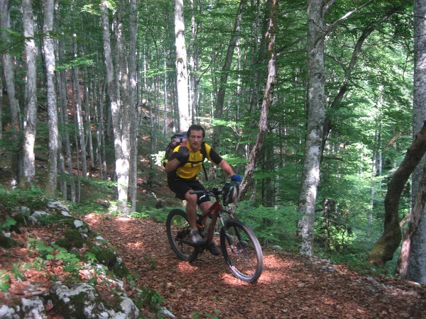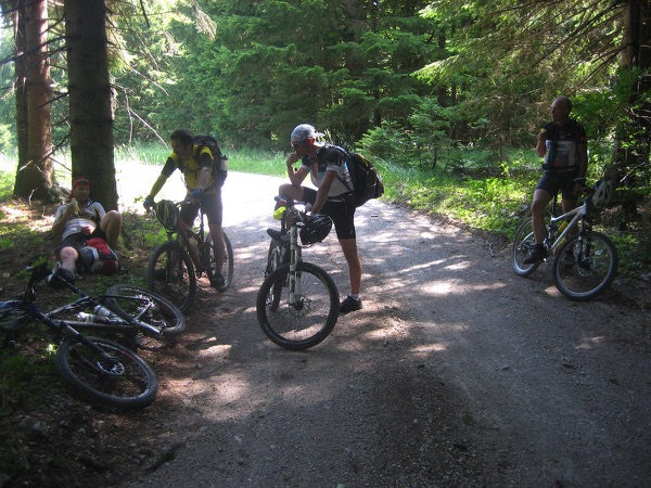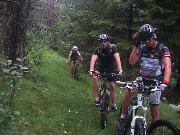 Nun folgt ein hartes Stück Arbeit, auf steilen Single Trails und dann auch auf meist recht gut fahrbaren Schotterstraßen geht es bis zum Abzweigung Richtung Sneznik auf ca. 1400m. Hier beginnt etwas was man im besten Fall als Wanderweg bezeichnen kann, manche (wie Robert Pracher und David Moser, welche die gleiche Tour ein paar Tage vor uns gemacht haben) würden es aber eher als Klettersteig bezeichnen und eine Begehung mit dem Fahrrad verweigern. Nicht so wir, wir nehmen die letzten 400 Hm hinauf zum Sneznik freilich auch noch mit, durch vom Schnee- und Winddruck verformte Buchenwälder und Latschen geht es teils schiebend, teils tragend hinauf Richtung Gipfel. Ober zieht ein Gewitter mit starken Windböen auf, wir retten uns in eine Notunterkunft, die Schutzhütte hat leider nicht geöffnet. Waagrecht aus unserer Behausung hinausgeworfene Bananenschalen landen am Dach des Hauses, so stark weht der Sturm. Nach 30 Minuten ist alles vorbei und wir können wieder abfahren, also dass Meiste halt (exklusive der ersten 200 Hm)...