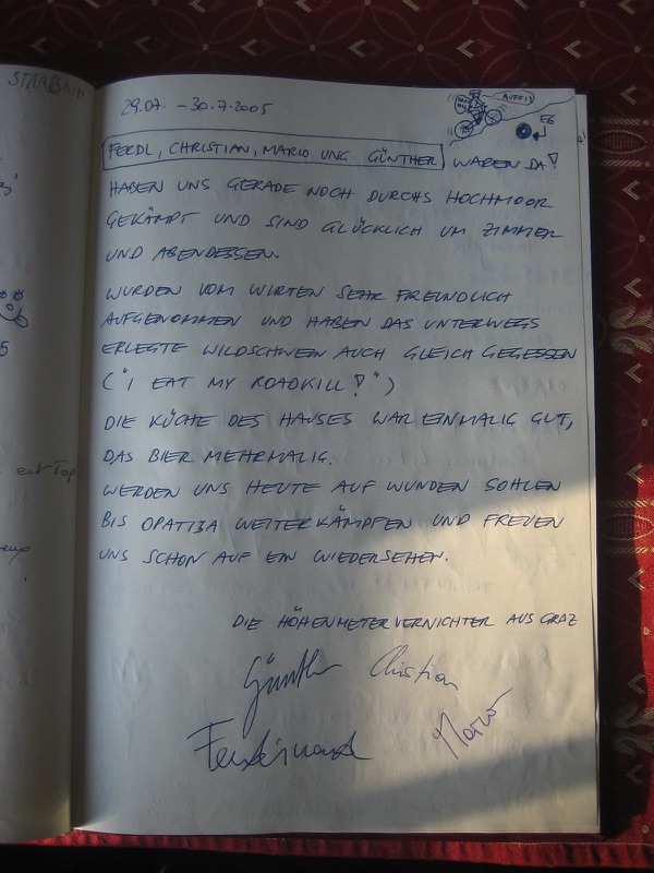 Dann folgt der wunderbare Anstieg hinauf durch Buchenwälder. Am Luisenstein vorbei geht es weiter bis hinauf zur Schotterstraße nach Masun. Wir bleiben aber hart zu uns selbst und zu unseren Boliden und nehmen die E6 Originalroute, welche parallel zur Schotterstraße quer durch das Gemüse führt. Einigermaßen erschöpft kommen wir beim einzigen Gasthaus weit und breit an, essen viel zu viel und werden viel zu müde.